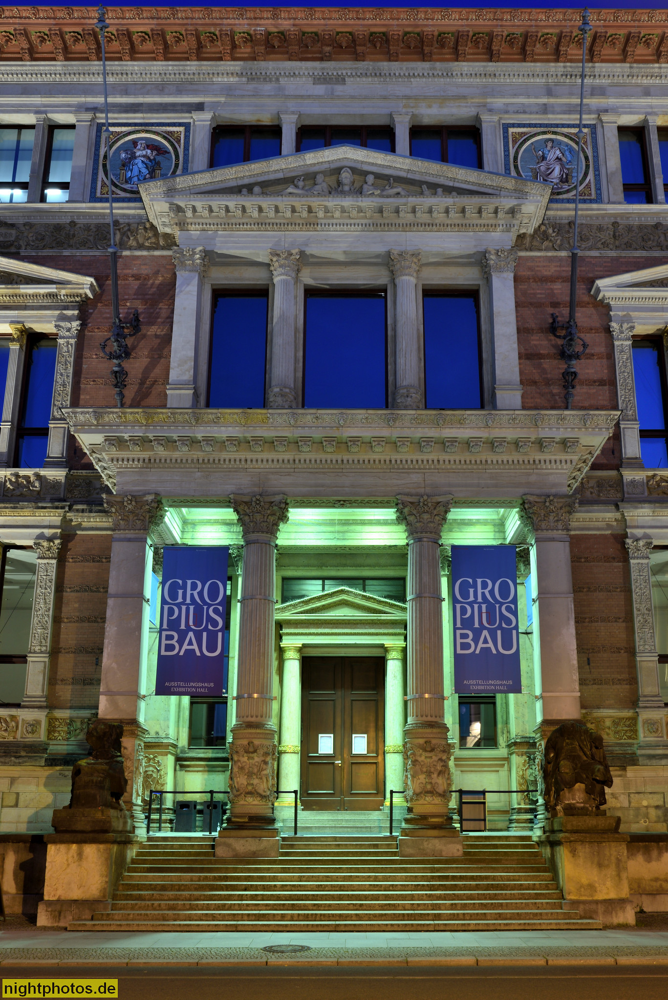 Martin-Gropius-Bau: Der Sockel des Erdgeschosses ist mit belgischem Granit verkleidet. Die Obergeschosse sind mit hell- und dunkelroten Klinkern verblendet. Die vierte Etage ist ein Mezzaningeschoss, dessen Fensterzwischenräume mit goldenen Mosaiken und den Wappen deutscher Länder geschmückt sind. Das Flachdach wird mit einem weit vorkragenden Terrakotta-Kranzgesims abgeschlossen
