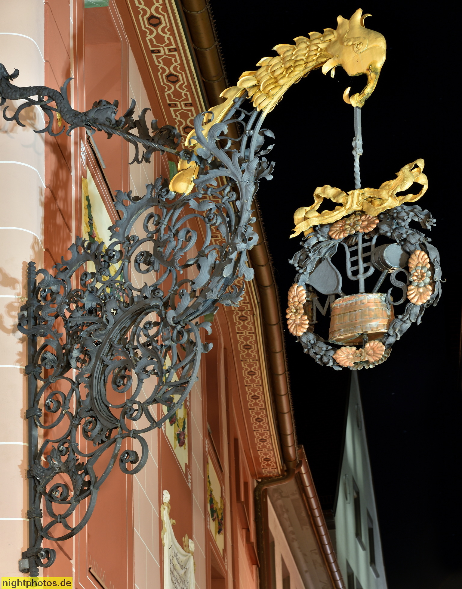 Freiburg. Gasthaus Grosser Meyerhof seit 1885. Erbaut bis 1460. Schmiedeeiernes Gasthausschild. Grünwälderstrasse 5-7