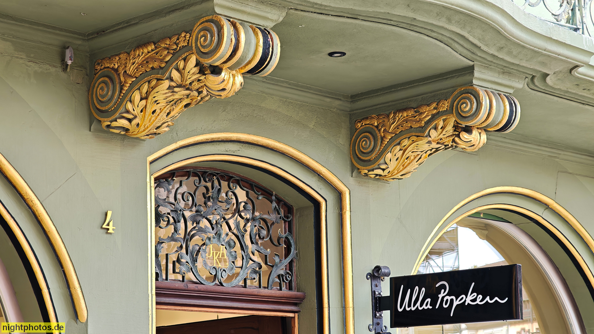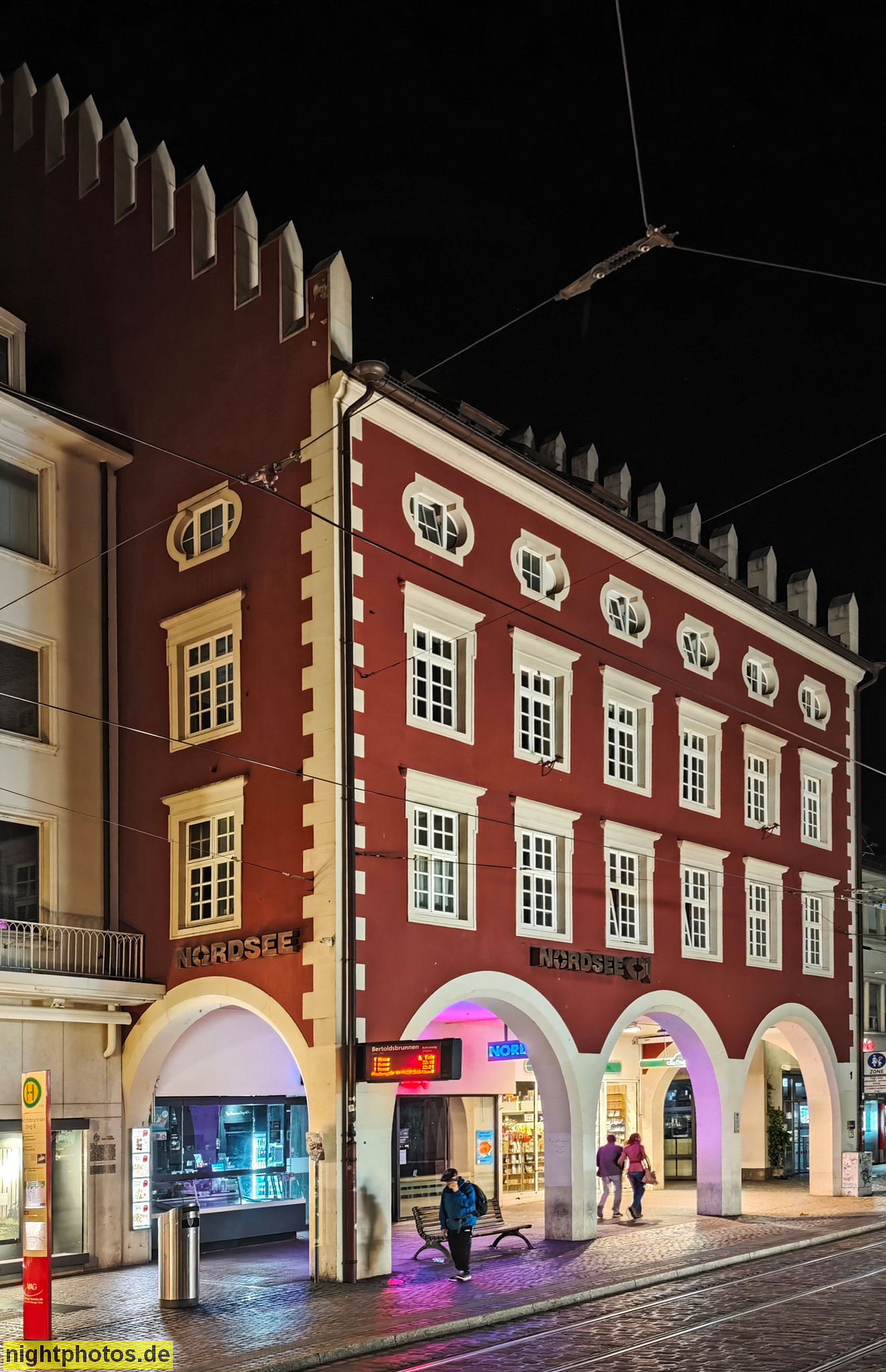 Freiburg. Ehem. Bankhaus Krebs. Erbaut 1460 als Haus zum Kempfen. Fassade 1753 barockisiert. Umbau 1904-1905 von Carl Anton Meckel. Saniert 1905. Portal mit Volutenkartusche. Münsterplatz 4