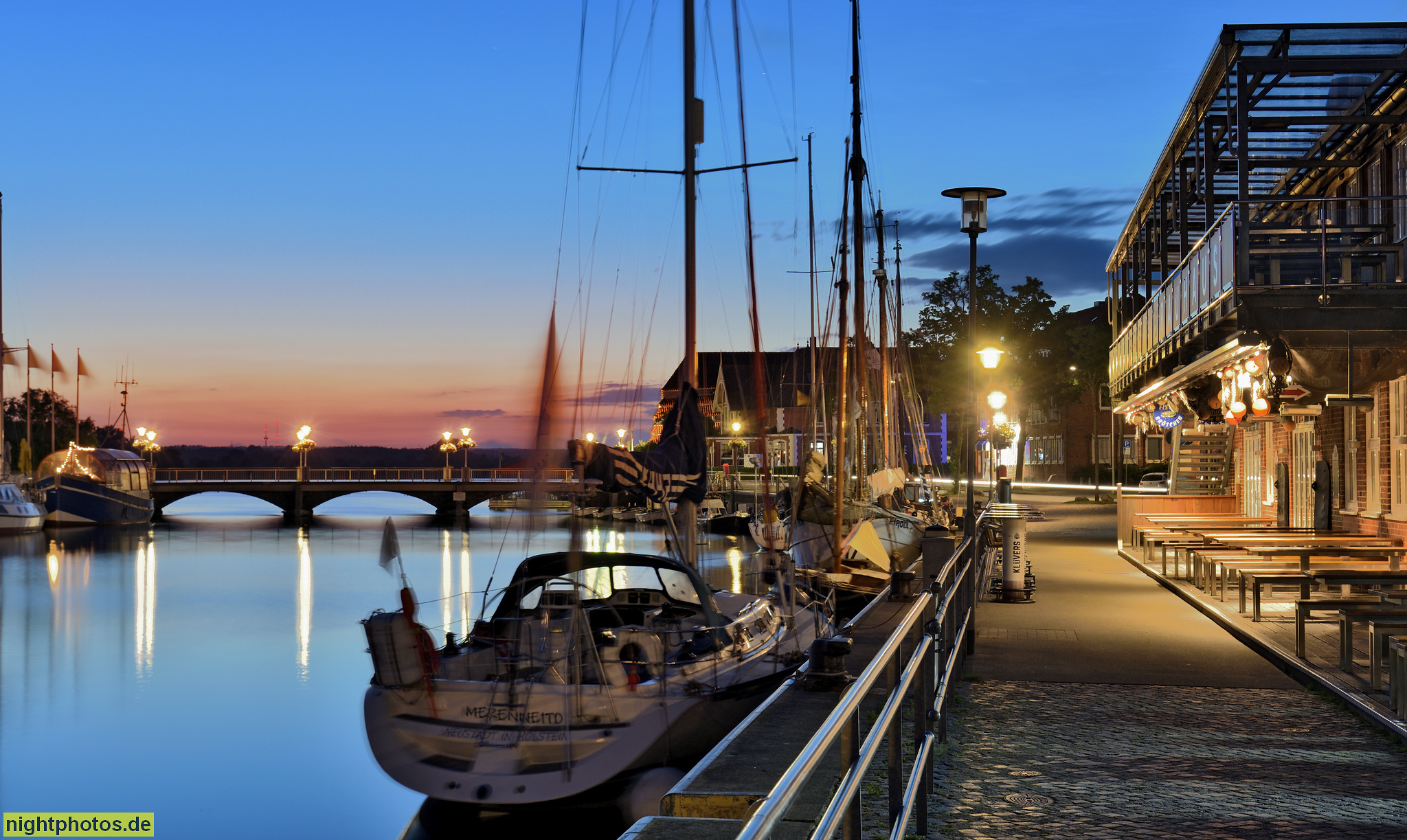 Neustadt in Holstein. Segelschiffe an der Neustädter Bucht am Unteren Jungfernstieg neben Klüvers Brauhaus. Segler 'Merenneito'. Hinten Neustädter Brücke über Binnenwasser. Schiffbrücke 2-4