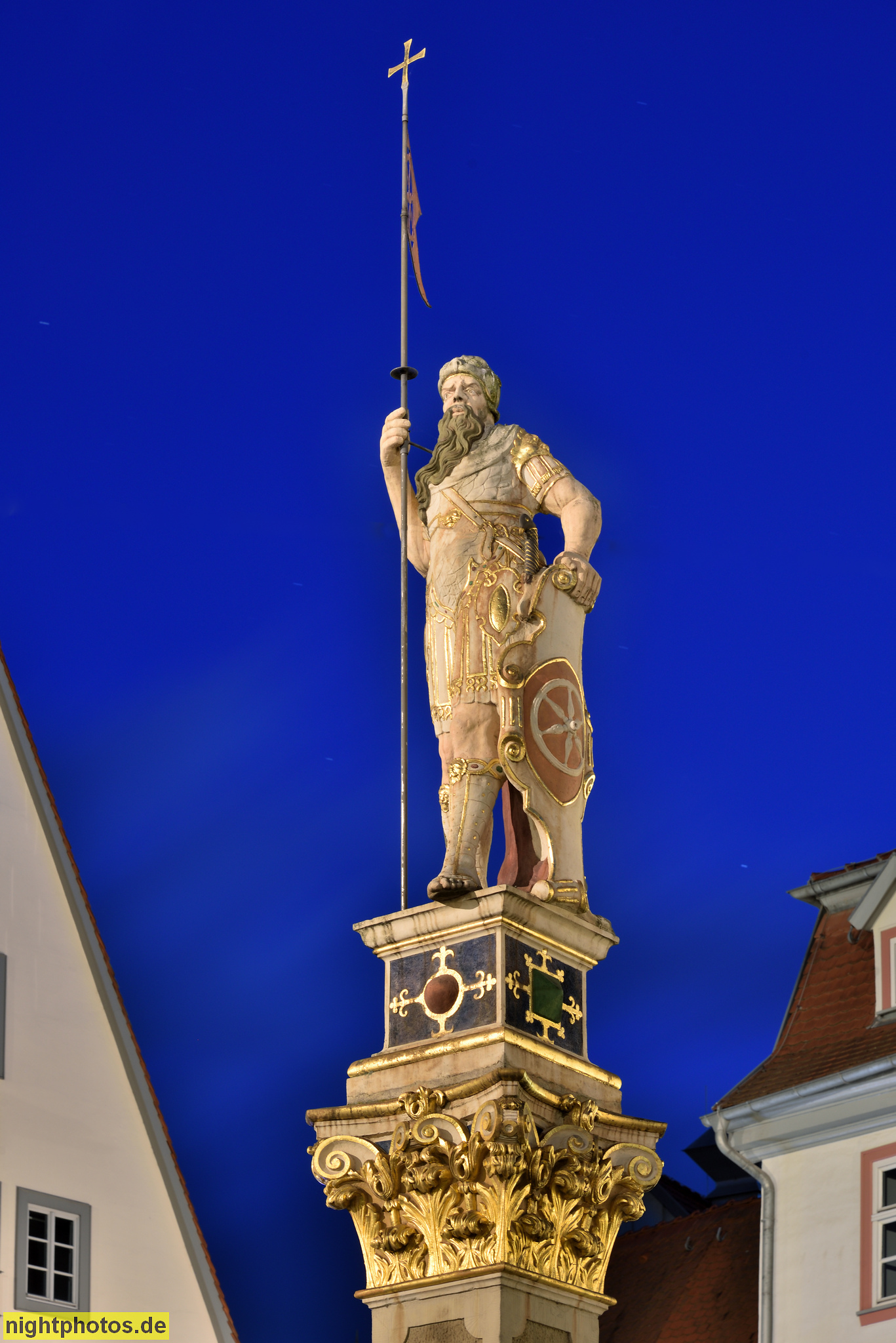Erfurt. Ratskeller mit Keller-Passage. Haus zur Güldenen Krone. Haus zum Roten Ochsen. Erbaut 1562 für Ratsherr Jacob Naffzer. Davor Denkmal mit Römer. Fischmarkt 5-7