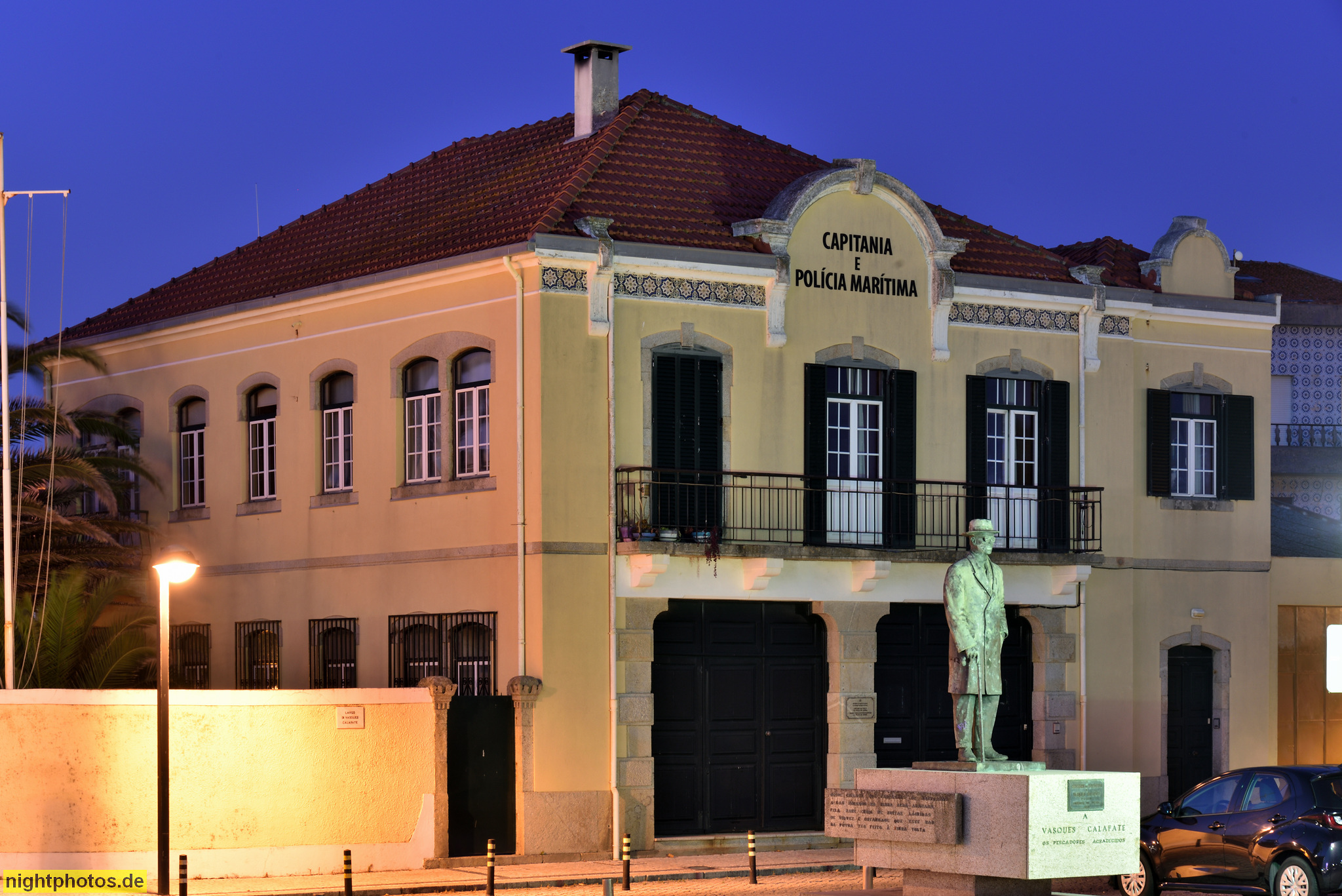 Póvoa de Varzim. Capitania é Policia Maritima. Hafen- und Seefahrtspolizei. Denkmal Vasques Calafate errichtet 1990. Largo Doutour Vasques Calafate