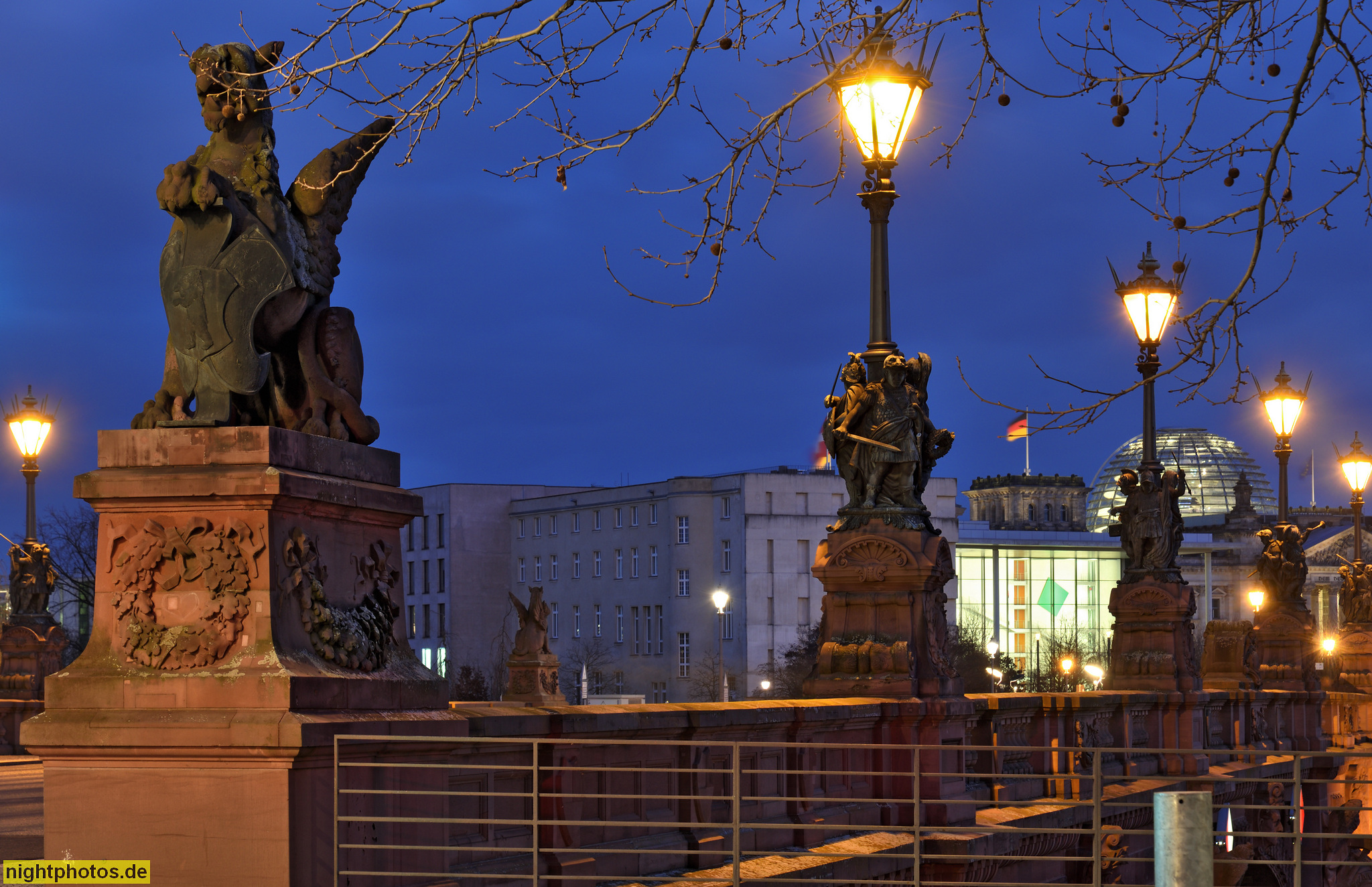 Berlin Mitte Moabit. Moltkebrücke über die Spree erbaut 1886-1891 von Otto Stahn und James Hobrecht. Verkleidet mit rotem Mainsandstein. Restauriert 1983-1986. Figuren von Johannes Boese und Karl Begas. Greife von Carl Piper. Kandelaber von 1890 aus der K