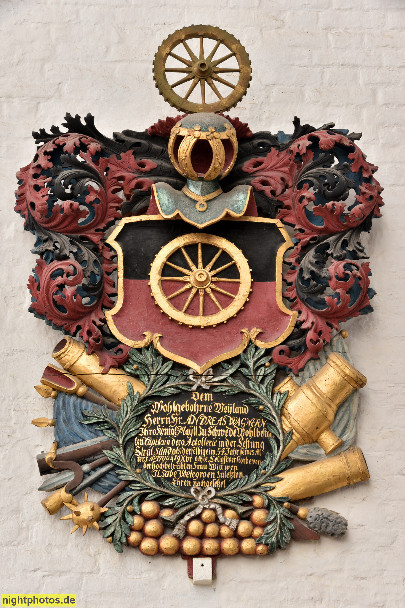 Stralsund. Altstadt. St. Marien erbaut im 14. Jhdt. in Spätgotik am Neuen Markt. Epitaph von Andreas Wagnern mit Waffen im Wappen