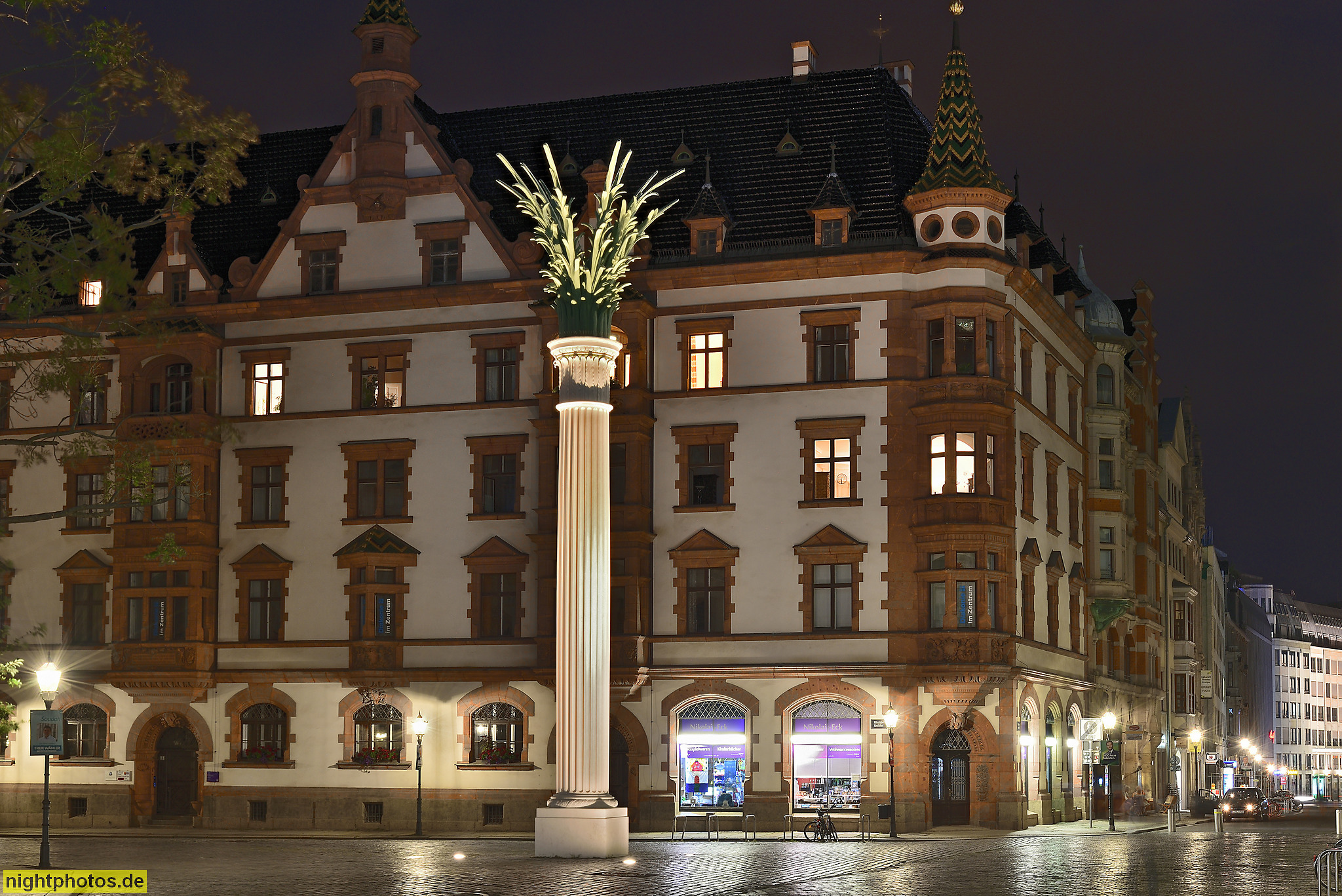 2019-07-27 25 Leipzig Nikolaikirchhof mit Nikolaisäule errichtet 1999. Replik einer Kirchensäule zur Erinnerung an die friedliche Revolution 1989