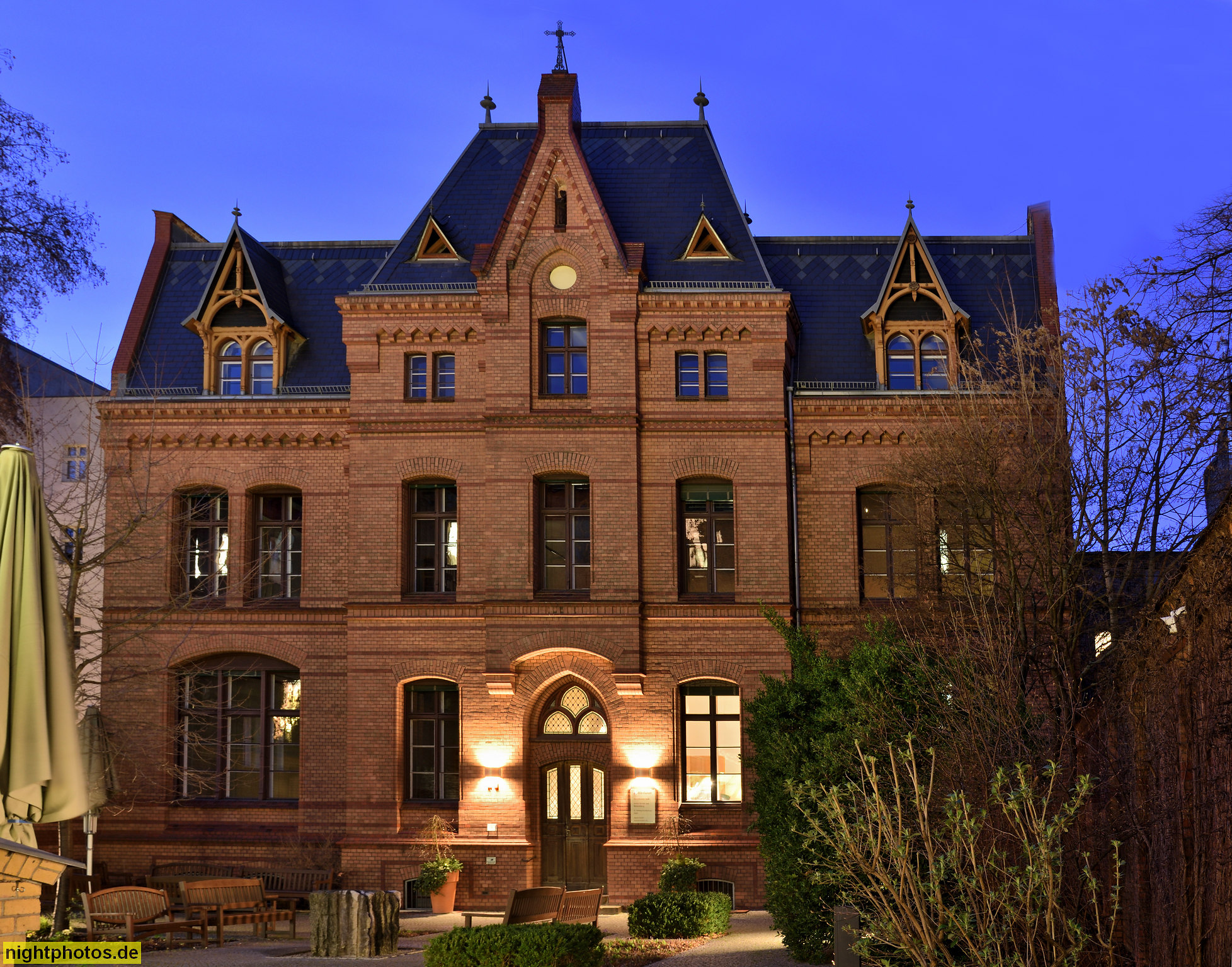 Inschrift am Gebäude: "1889 Dem Geisteslicht zum Schutze, gemeinen Wohl zum Nutze 1892"
