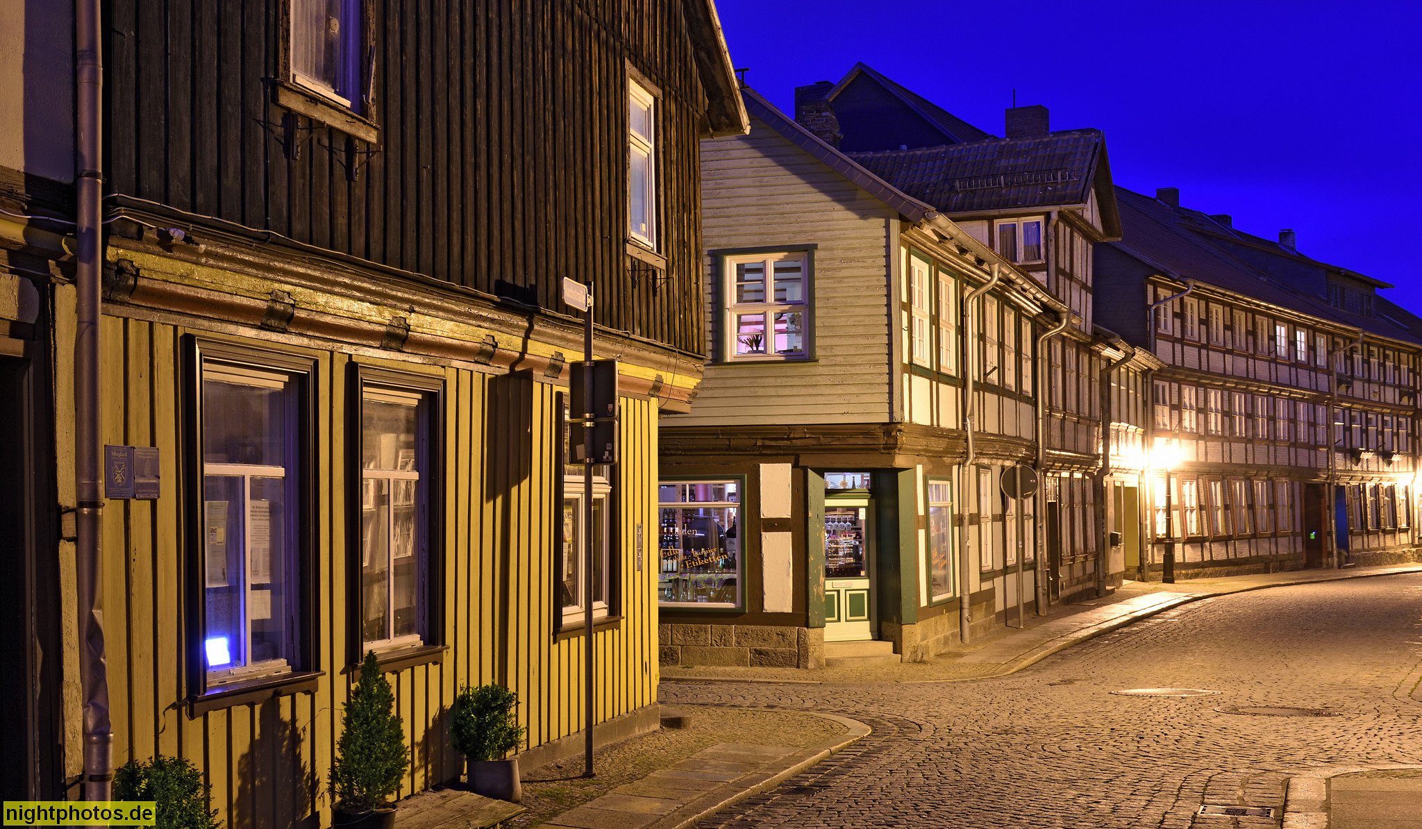 Wernigerode. Marktstrasse Abzweig Kochstrasse. Fachwerkbauten. Kleinstes Haus Kochstrasse 43. Bronzeskulptur 'Die Rast' von Joe Jastram 2004