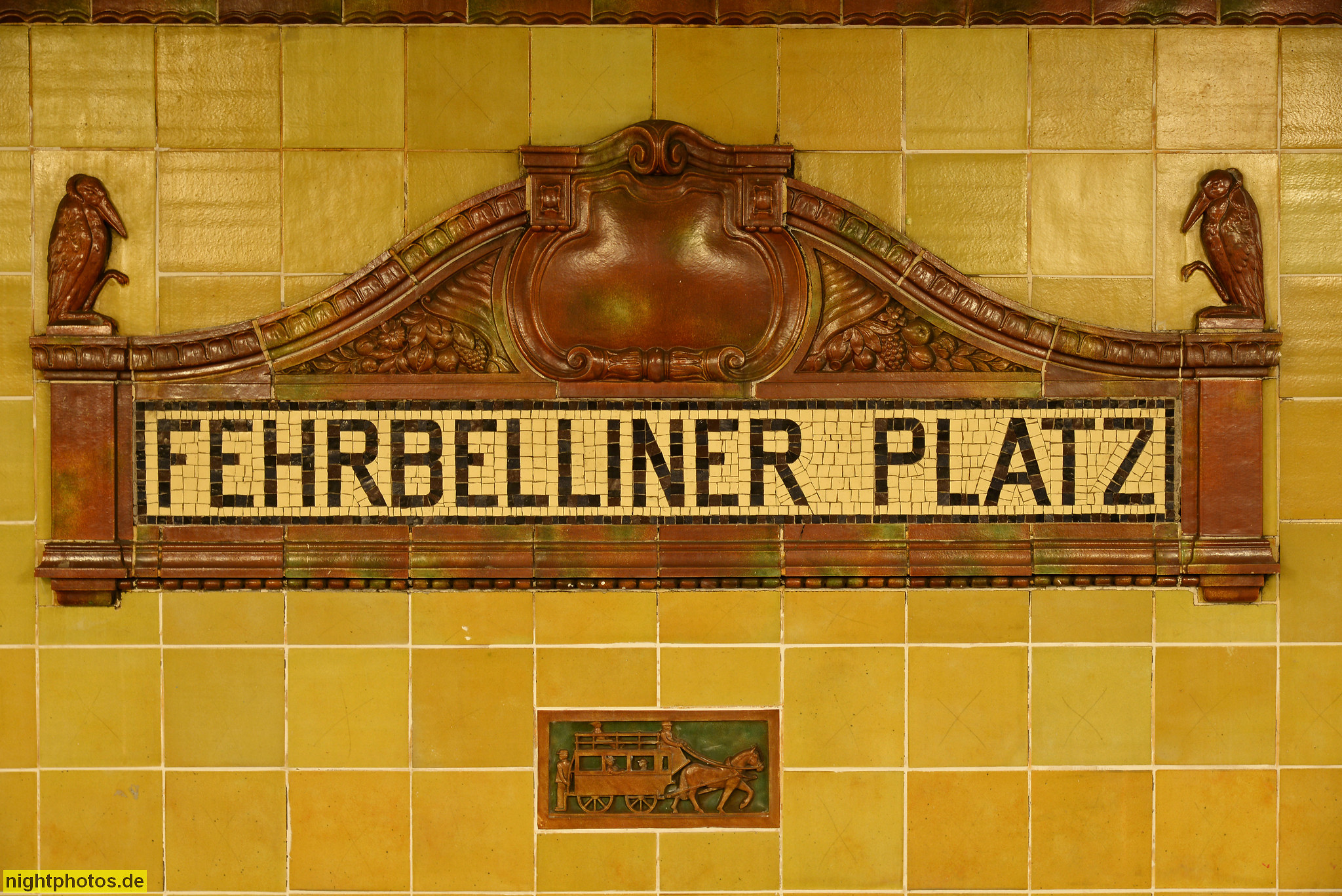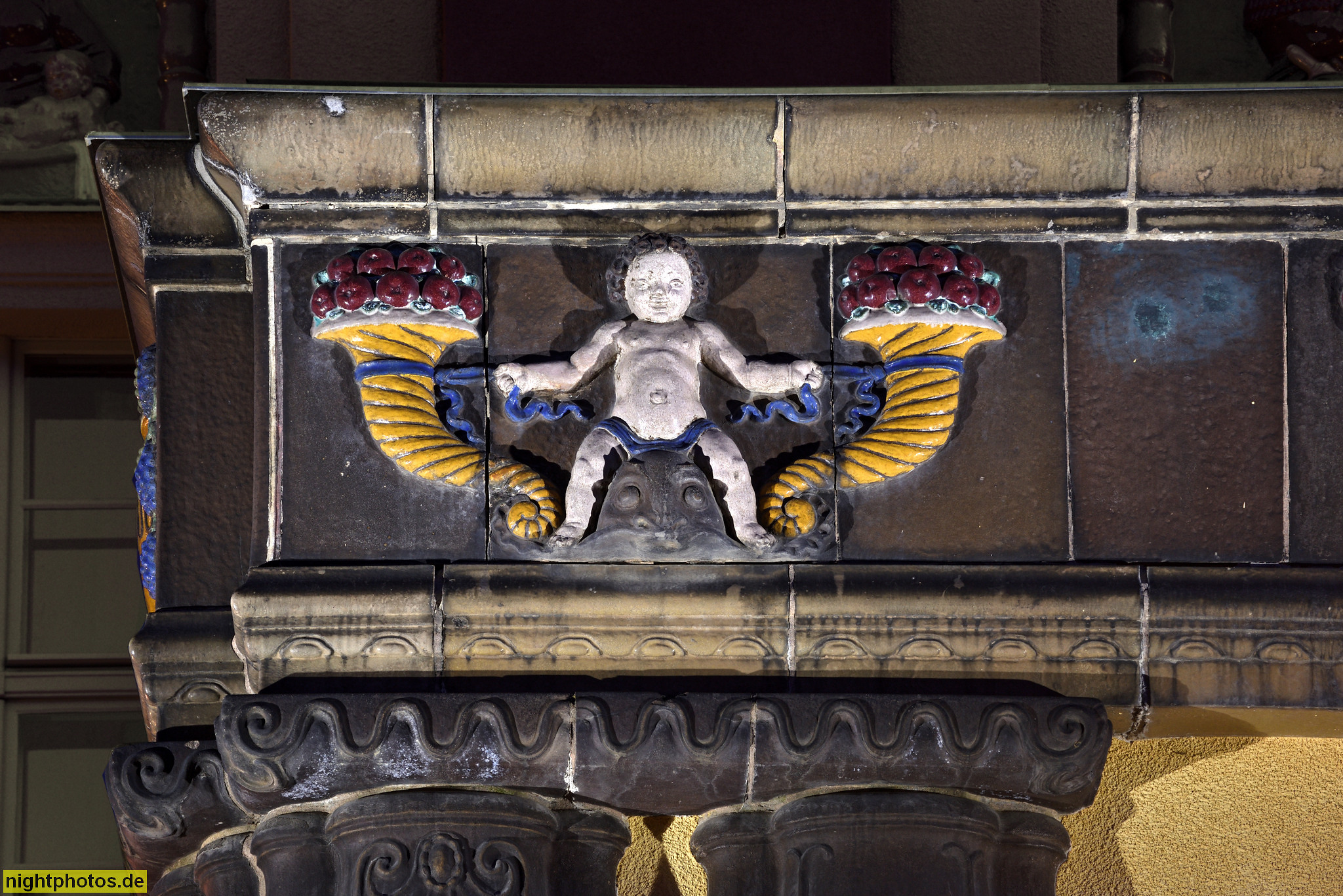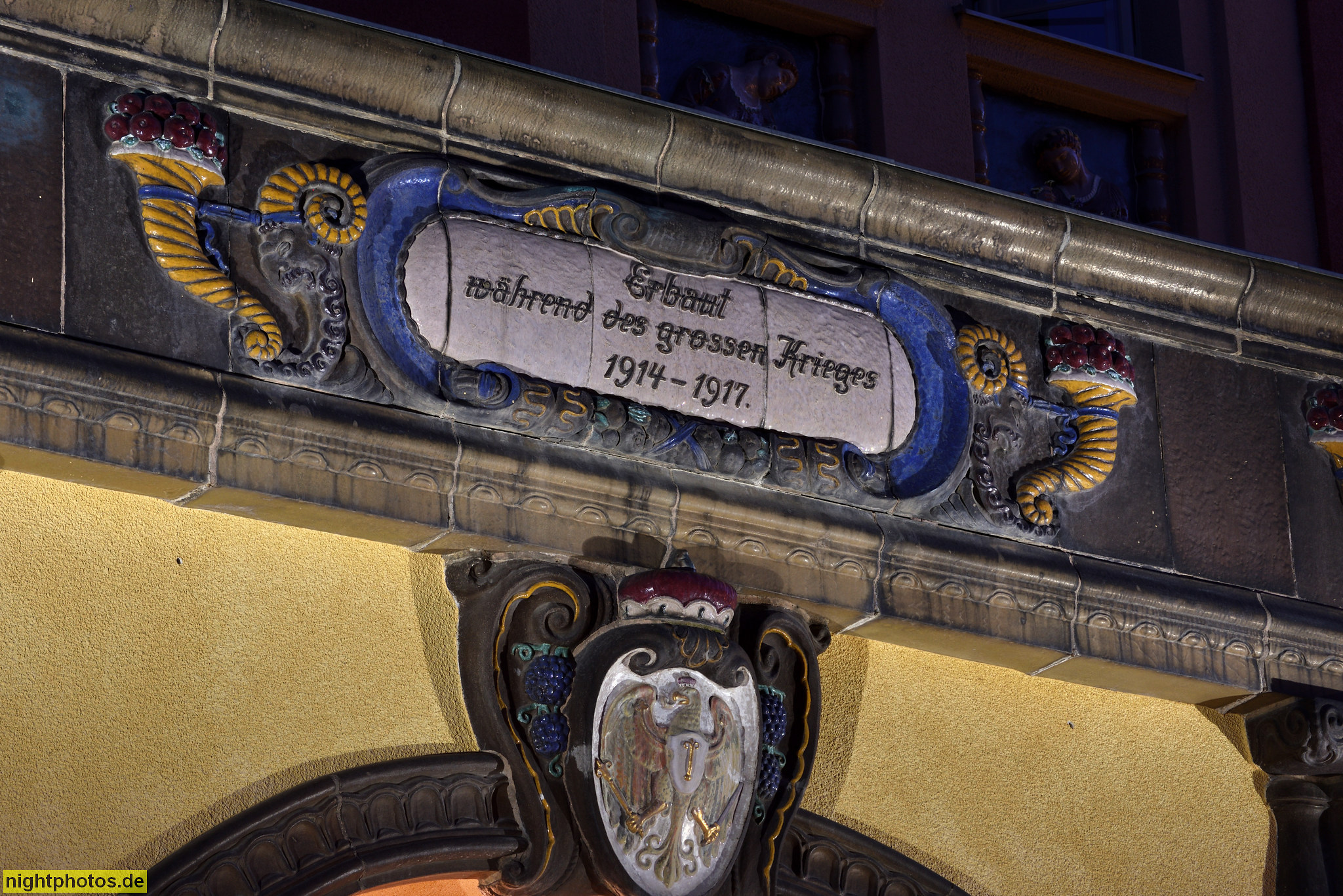 Berlin Neukölln. Wohnpark St. Marien. Haus Clara. Erbaut 1914-1917 von Baurat Theodor Goecke. Wandkeramik Majoliken. Fassadenreliefs von Roch und Feuerhahn. Mariendorfer Weg 35