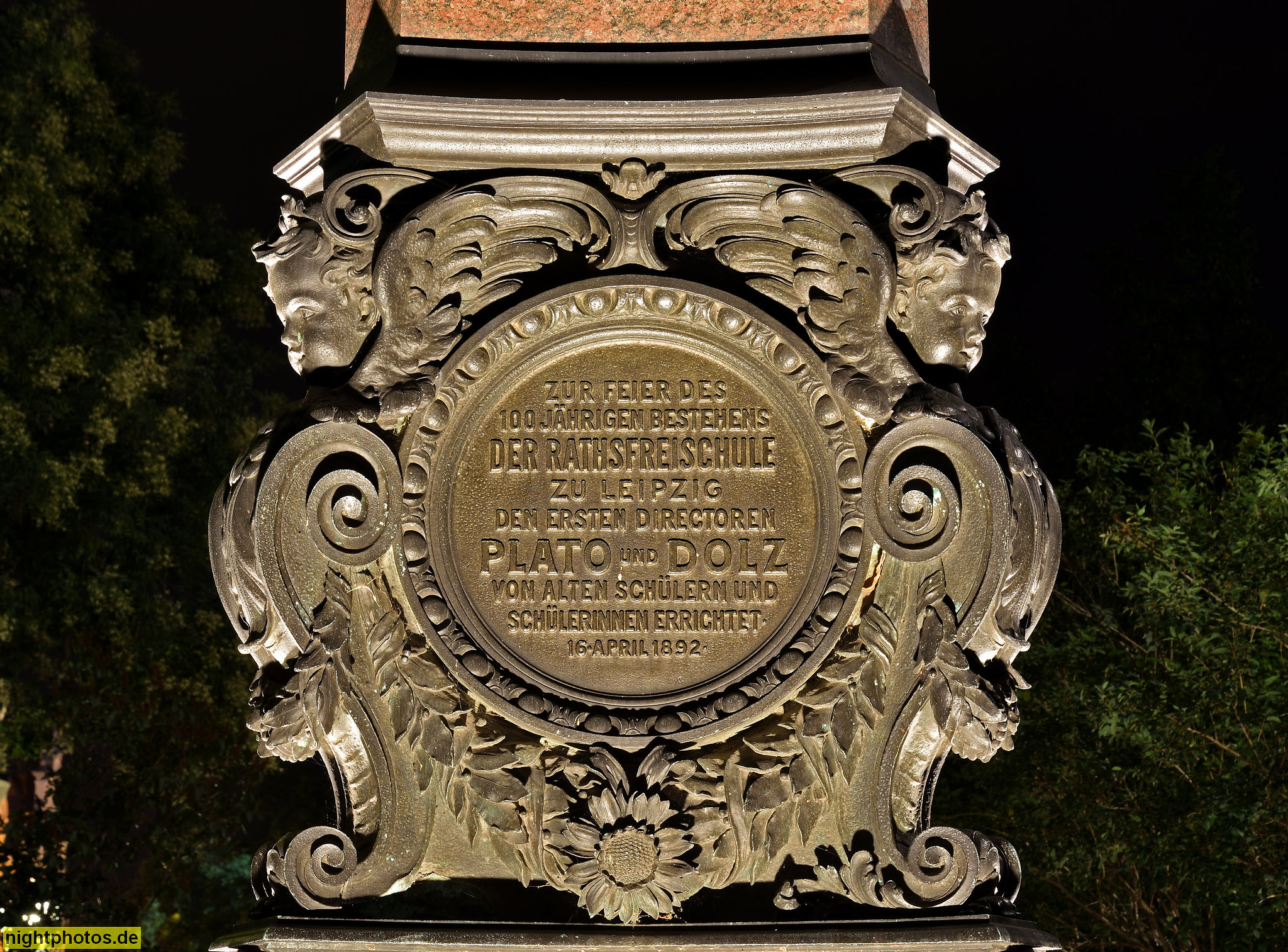 Inschrift: Zur Feier des100jährigen Bestehens der Ratsfreischule zu Leipzig den ersten Direktoren Plato und Dolz von allen Schülern und Schülerinnen errichtet 16. April 1892"