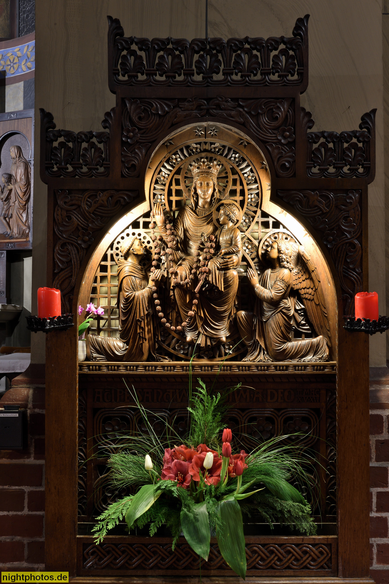 Berlin Steglitz Katholische Rosenkranzbasilika. Als Pfarrkirche erbaut 1899-1900 von Christoph Hehl. Votivbild in Holzreliefarbeit. Überreichung des Rosenkranz an den Heiligen Dominikus. Kieler Strasse 11