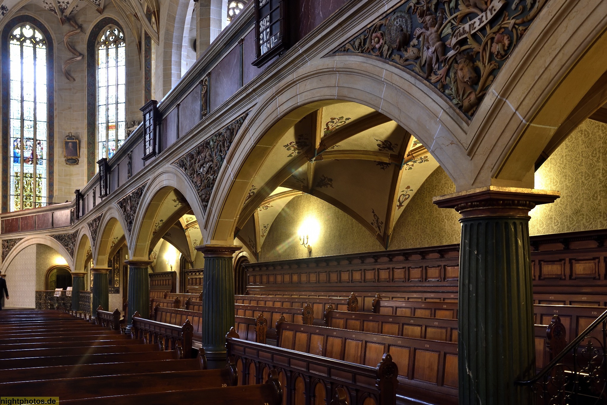 Inschrift im Portal: "Gloria in Excelsis Deo: Hanns Christoph Volckamer inwendig mich neu baute als Gott fünft Jahr zuvor ihm diese Stadt vertraute. Durchs Bürgermeister Ambt, gib höchster Gott gib Gnade das mir die Feuers Gluth, noch sonst ein Feind nicht schade. Anno 1673"