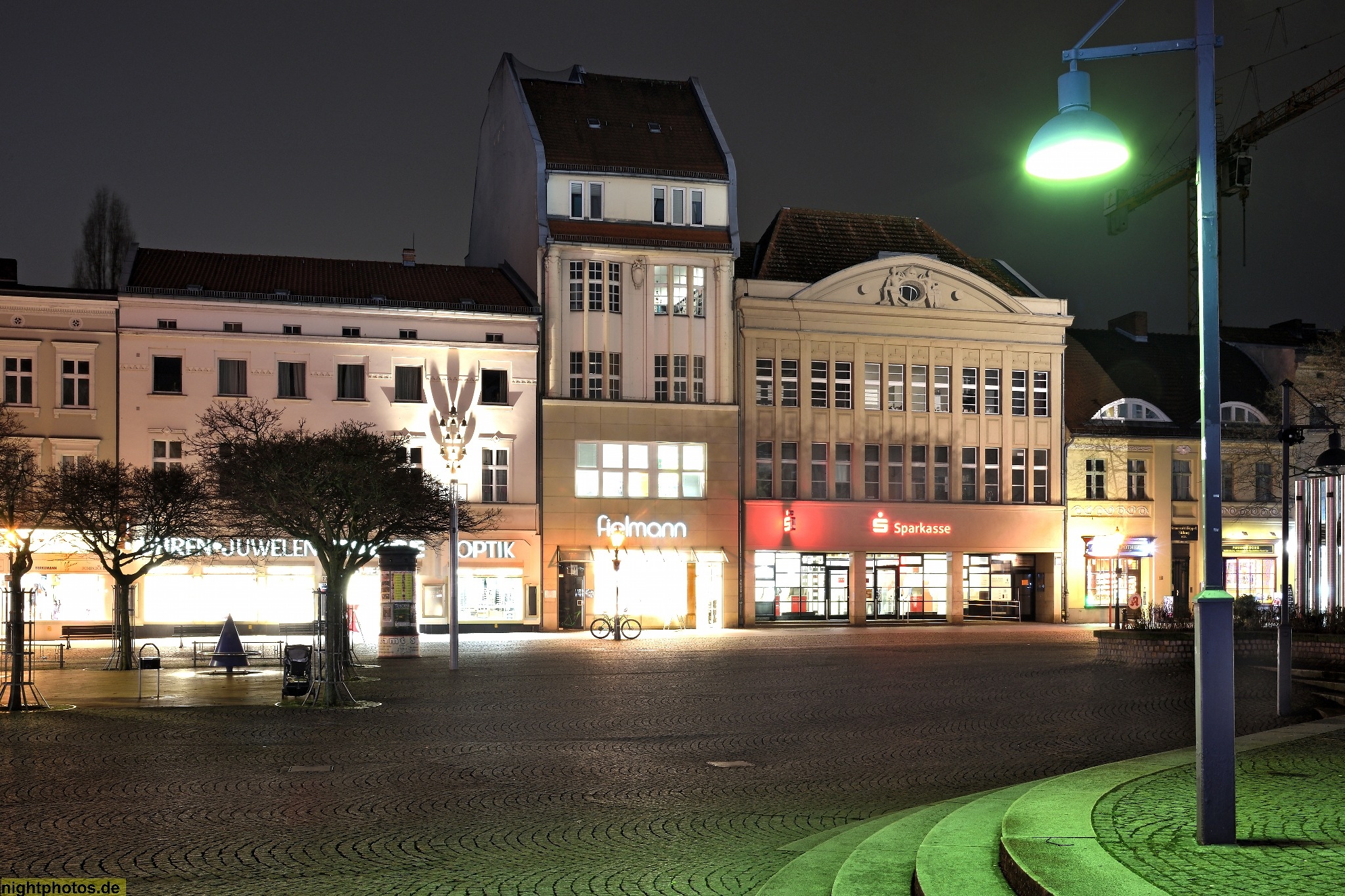 Links: Mietshaus mit Seitenflügel erbaut 1875, Mitte links: Wohn- und Geschäftshaus erbaut 1912; Mitte Rechts: Sparkasse war ehemaliges Kaufhaus Sternberg erbaut 1927-28, Rechts: Wohnhaus erbaut ca. 1850-1870
