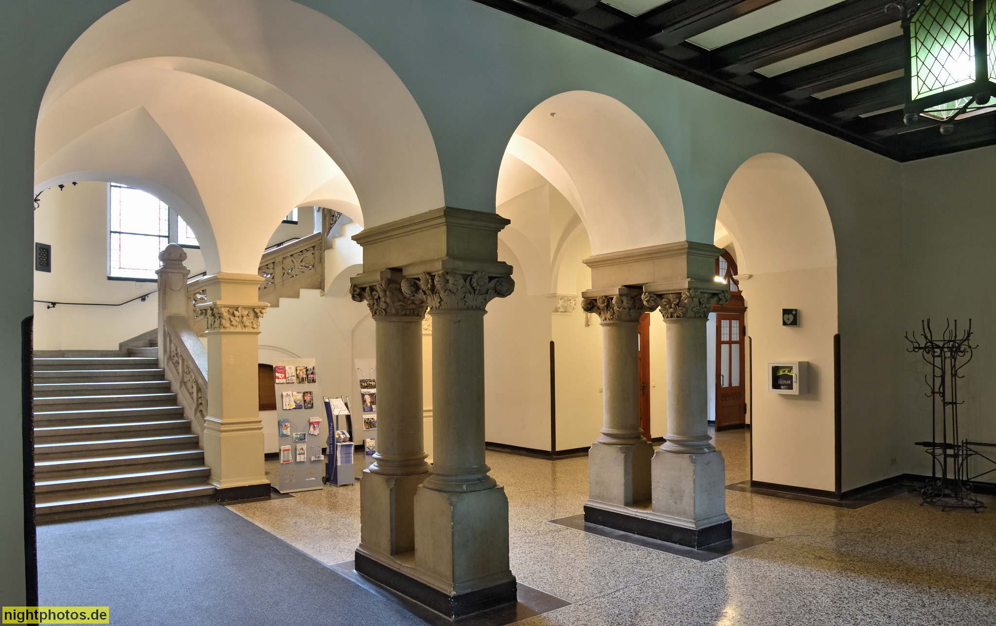 Quedlinburg. Rathaus erbaut ab 1300. Eingangshalle mit Tonnengewölbe auf Doppelsäulen und Pfeilern. Treppenhaus