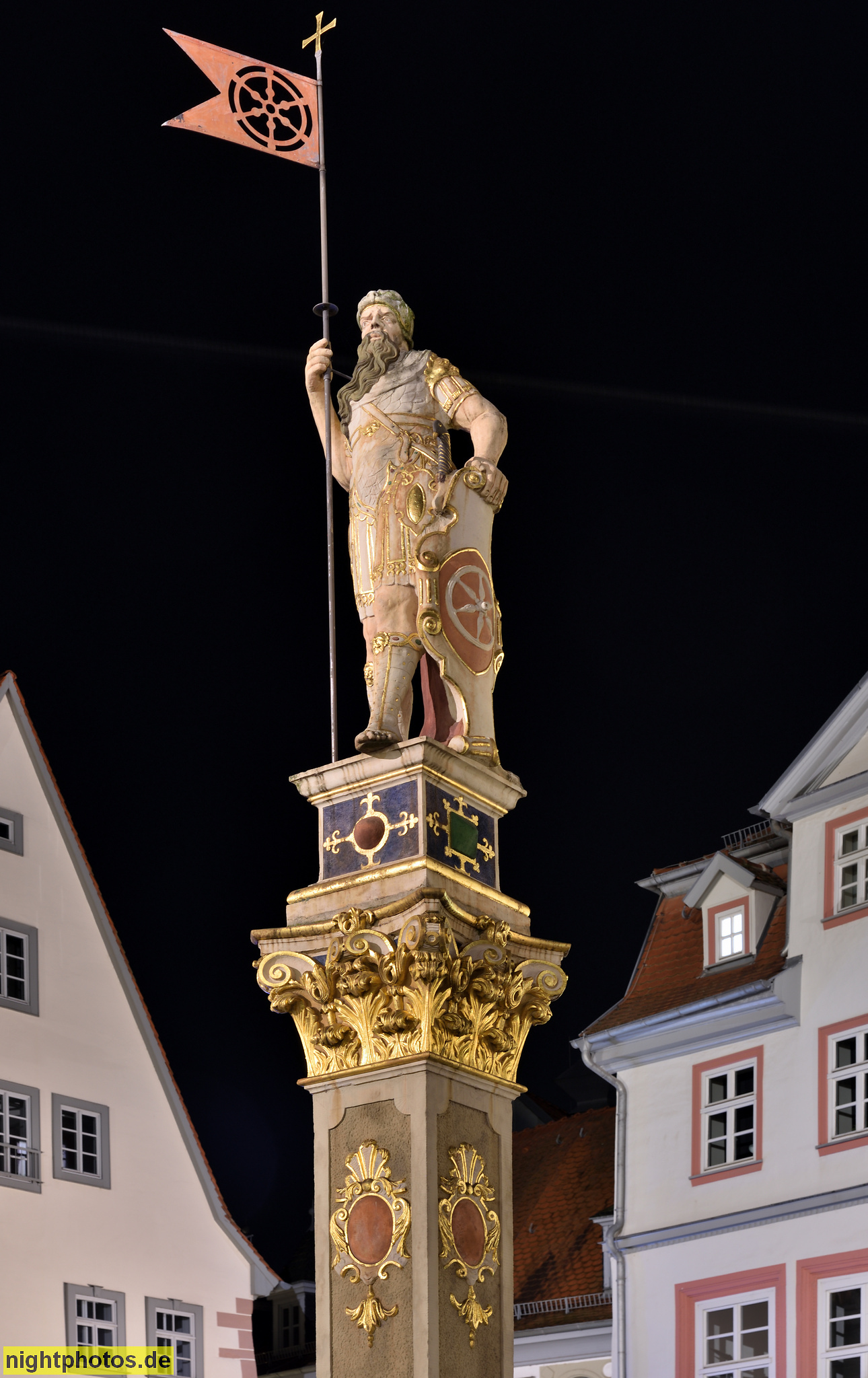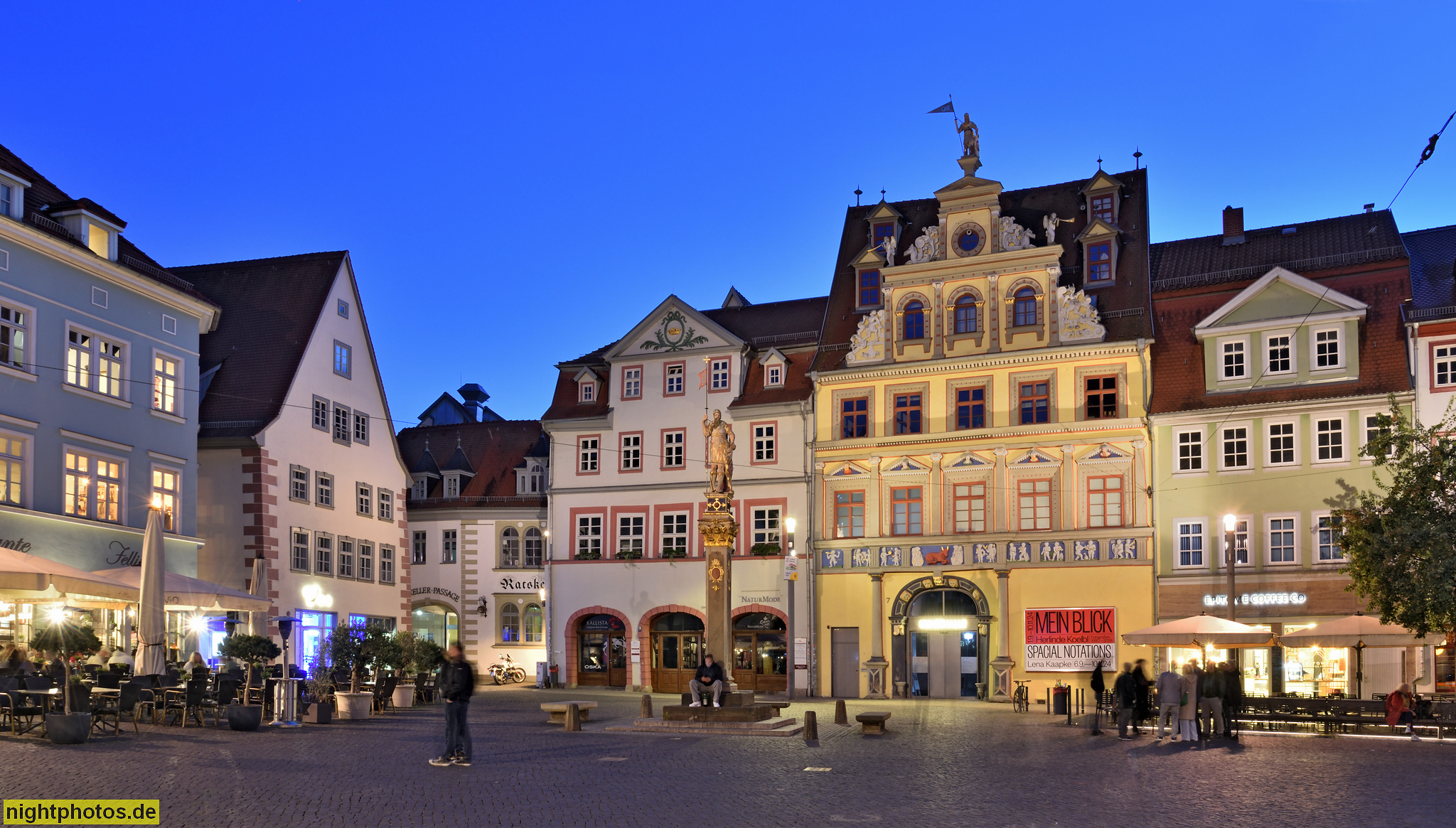 Erfurt. Römer. Krieger mit Stadtfahne von Erfurt. Erschaffen 1591 von Israel von der Milla. Aufgestellt 1886. Säule aus 18.Jhdt. Geschäftshaus mit Sparkasse. Ristorante Fellini. Fischmarkt