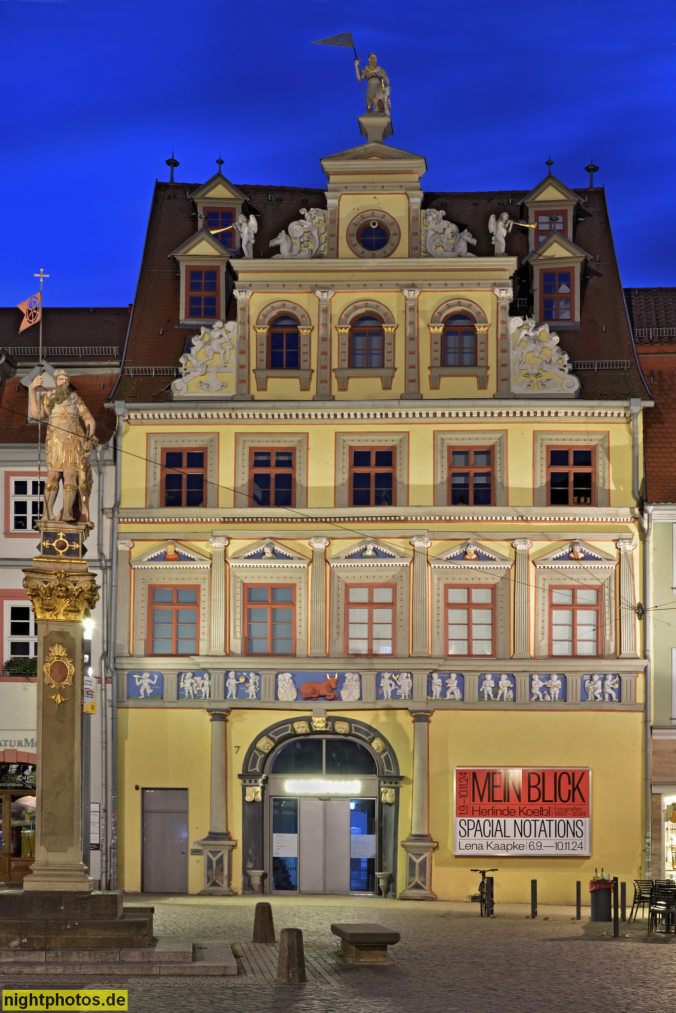 Erfurt. Ratskeller mit Keller-Passage. Haus zur Güldenen Krone. Haus zum Roten Ochsen. Erbaut 1562 für Ratsherr Jacob Naffzer. Davor Denkmal mit Römer. Fischmarkt 5-7