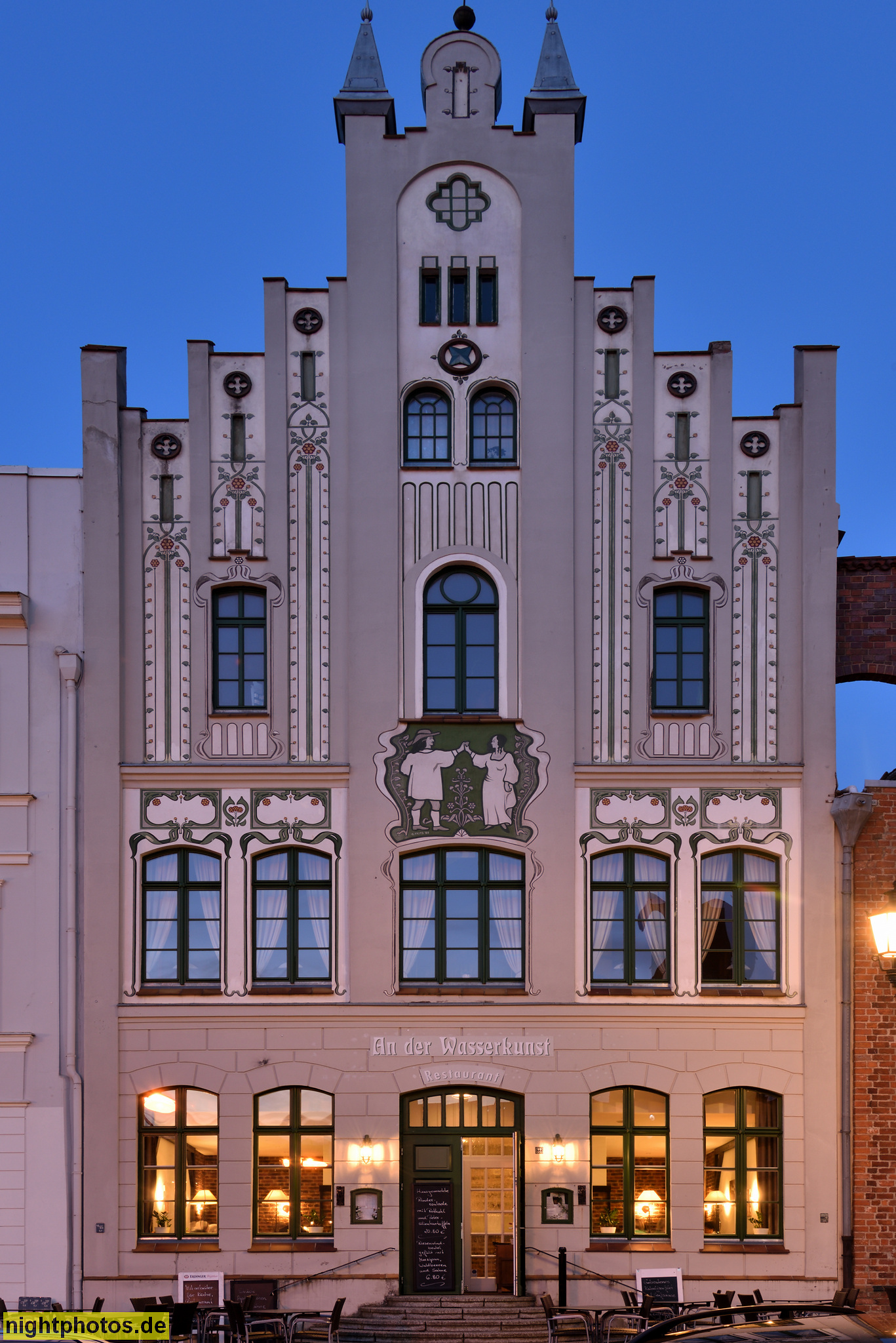 Wismar. Giebelhaus mit Restaurant 'An der Wasserkunst'. Am Markt 22