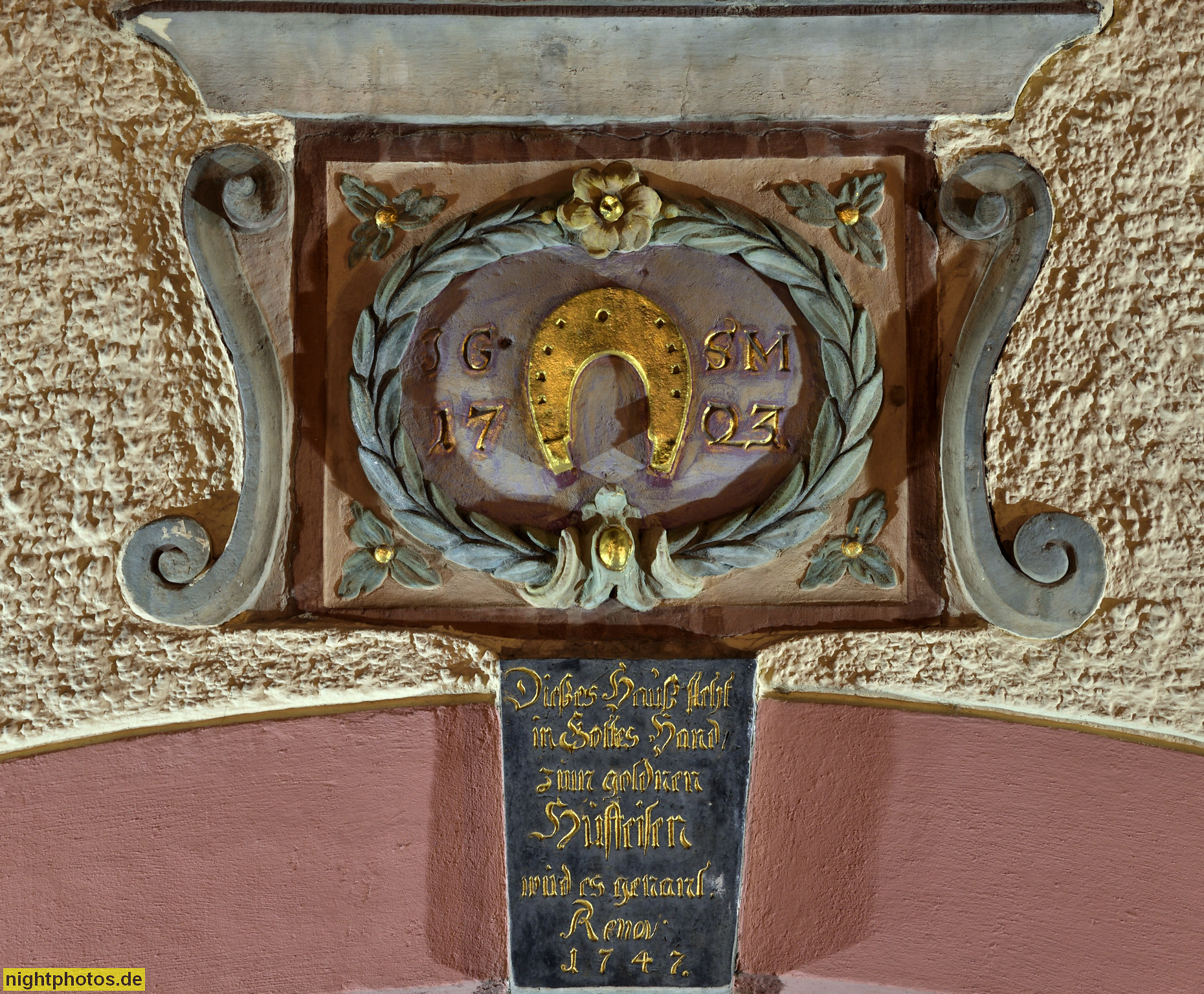 Inschrift: 'Dieses Haus steht in Gottes Hand zum Hufeisen wird es genannt Renov 1747'