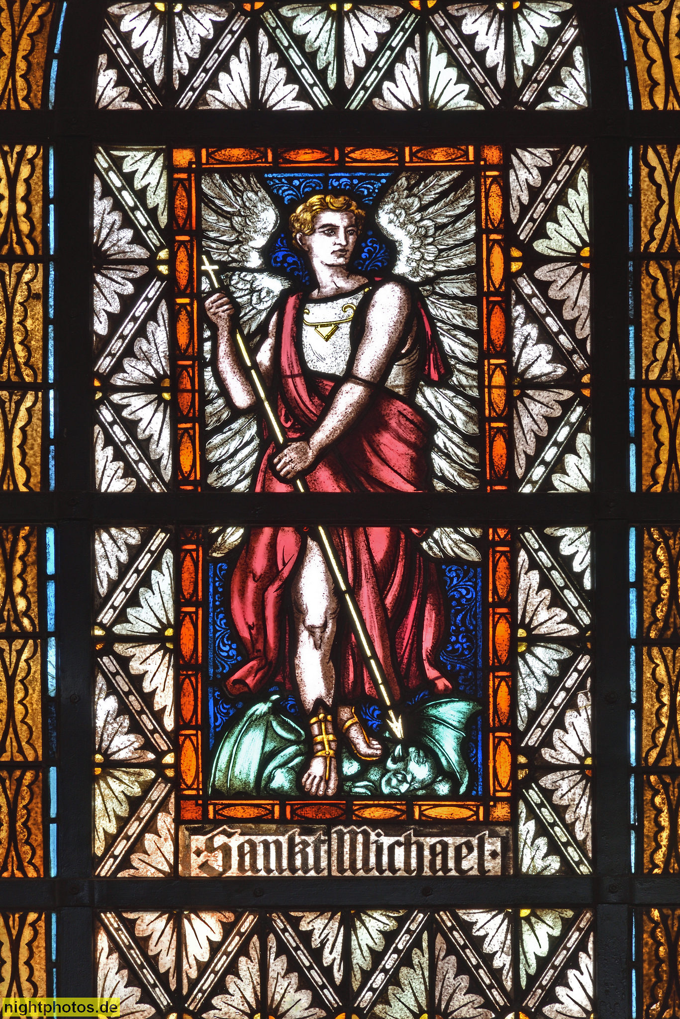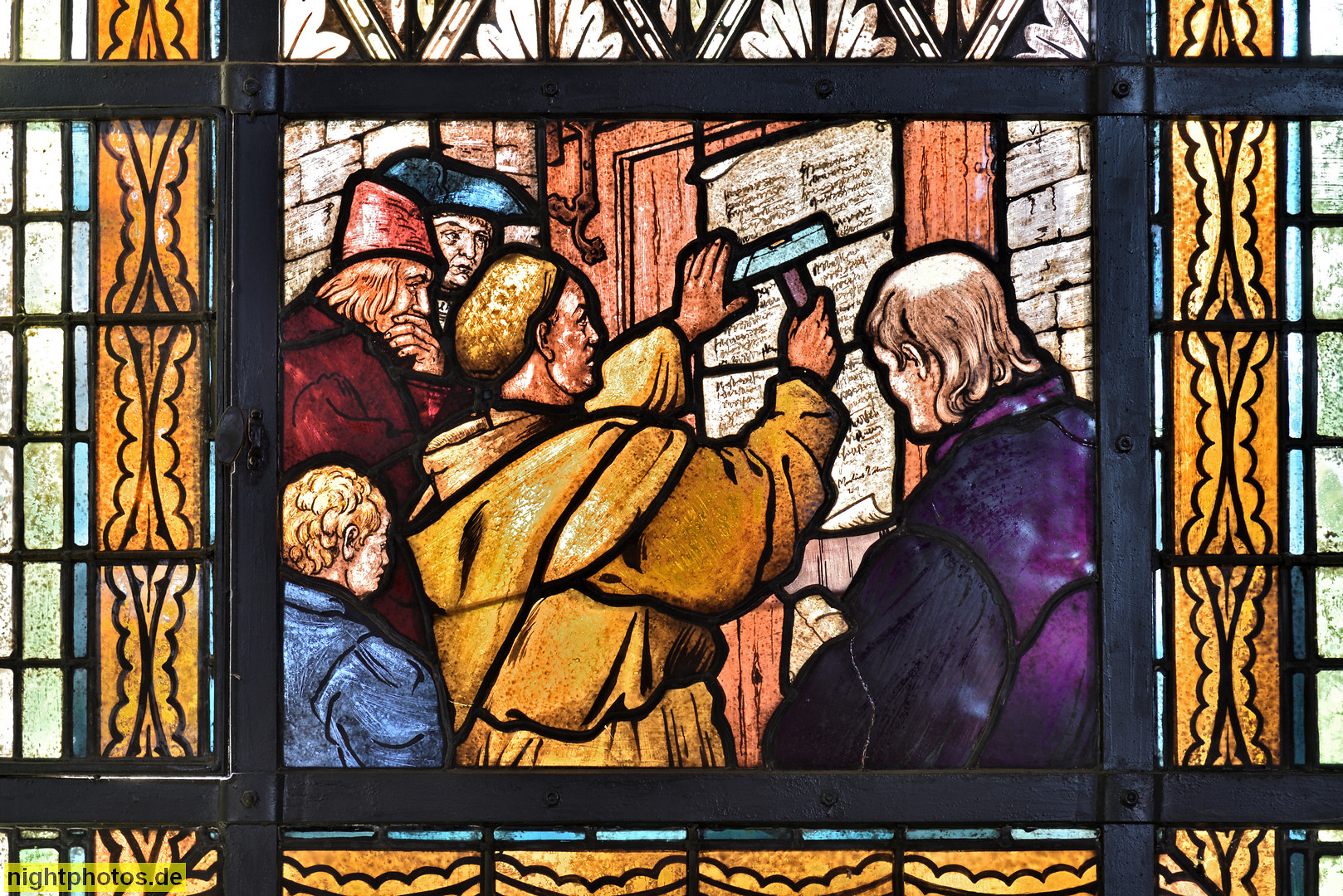 Quedlinburg. Rathaus erbaut ab 1300 aus Werkstein. Rundfenster des Sitzungssaals mit Glasgemälde auf Bleiglas erschaffen 1901 von Ferdinand Müller