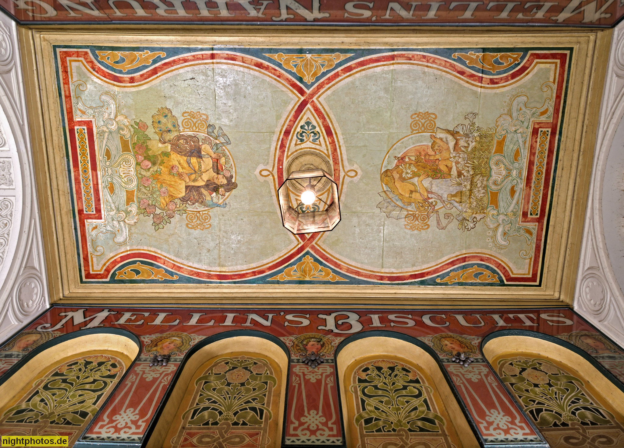 Hamburg. Mellinpassage in den Alsterarkaden. Erbaut 1843-1846 von Alexis de Chateauneuf an der Kleinen Alster. Jugendstil Deckenmalerei