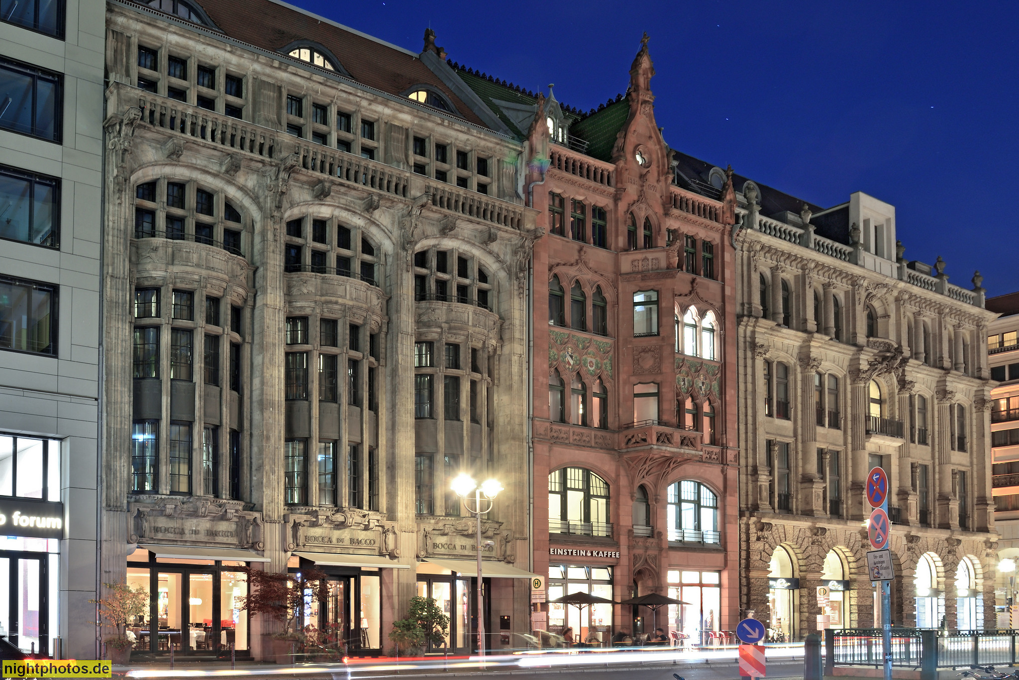Restaurant Bocca di Bacco im ehemaligen Geschäftshaus 'Automat' erbaut 1904-1905 von Bruno Schmitz. Einstein Kaffee im Geschäftshaus erbaut 1899 von Ferdinand Wendelstadt und Max Welsch. Hugo Boss im ehemaligen Ausschankgebäude der Pschorr-Brauerei erbuat 1887-1889 von Heinrich Joseph Kayser und Karl von Grossheim.