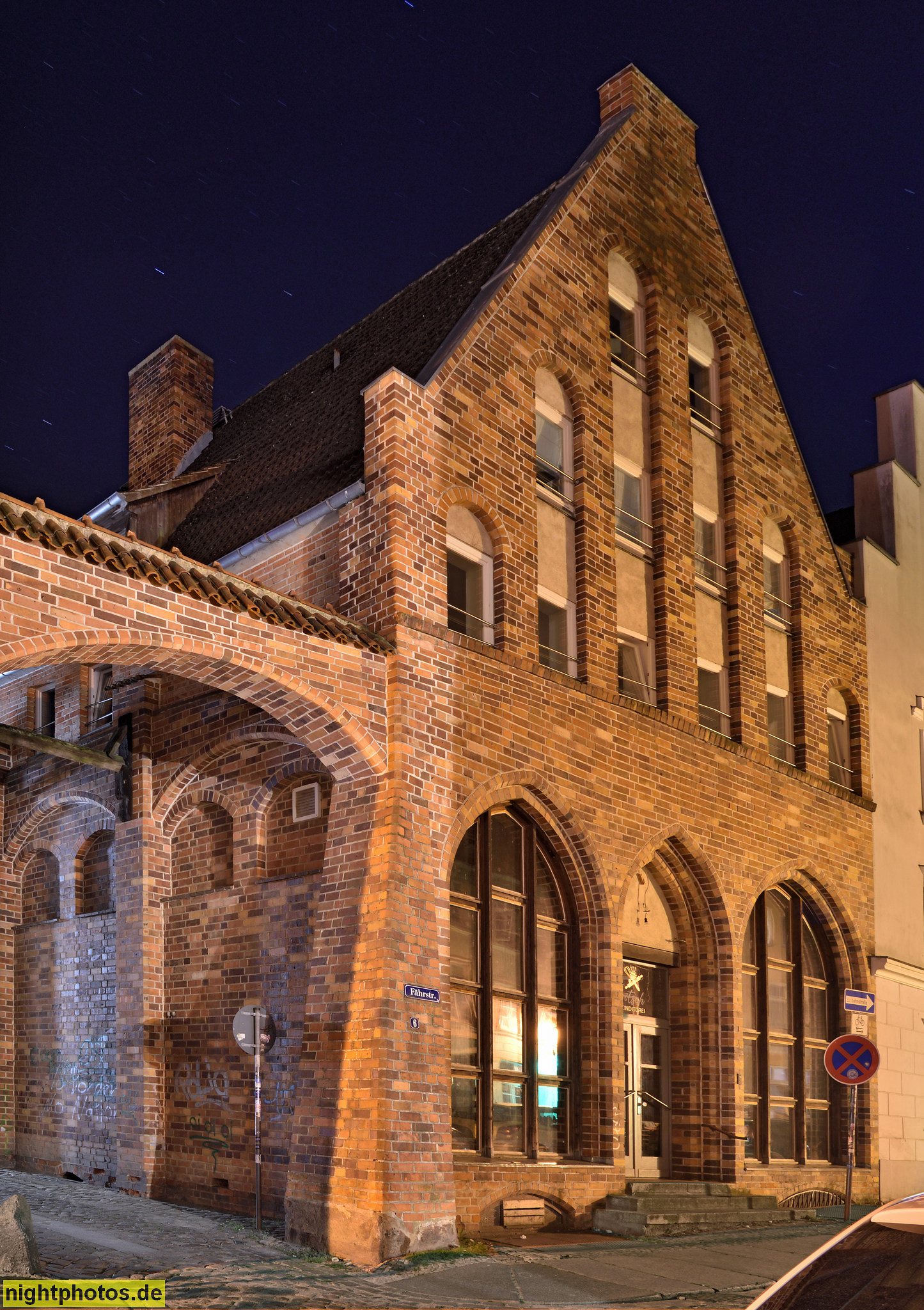 An der Giebelspitze befindet sich das bis 1918 gültige Wismarer Wappen aus Stierkopf und Streifen. At the top of the gable is the Wismar coat of arms, which consisted of a bull's head and stripes until 1918