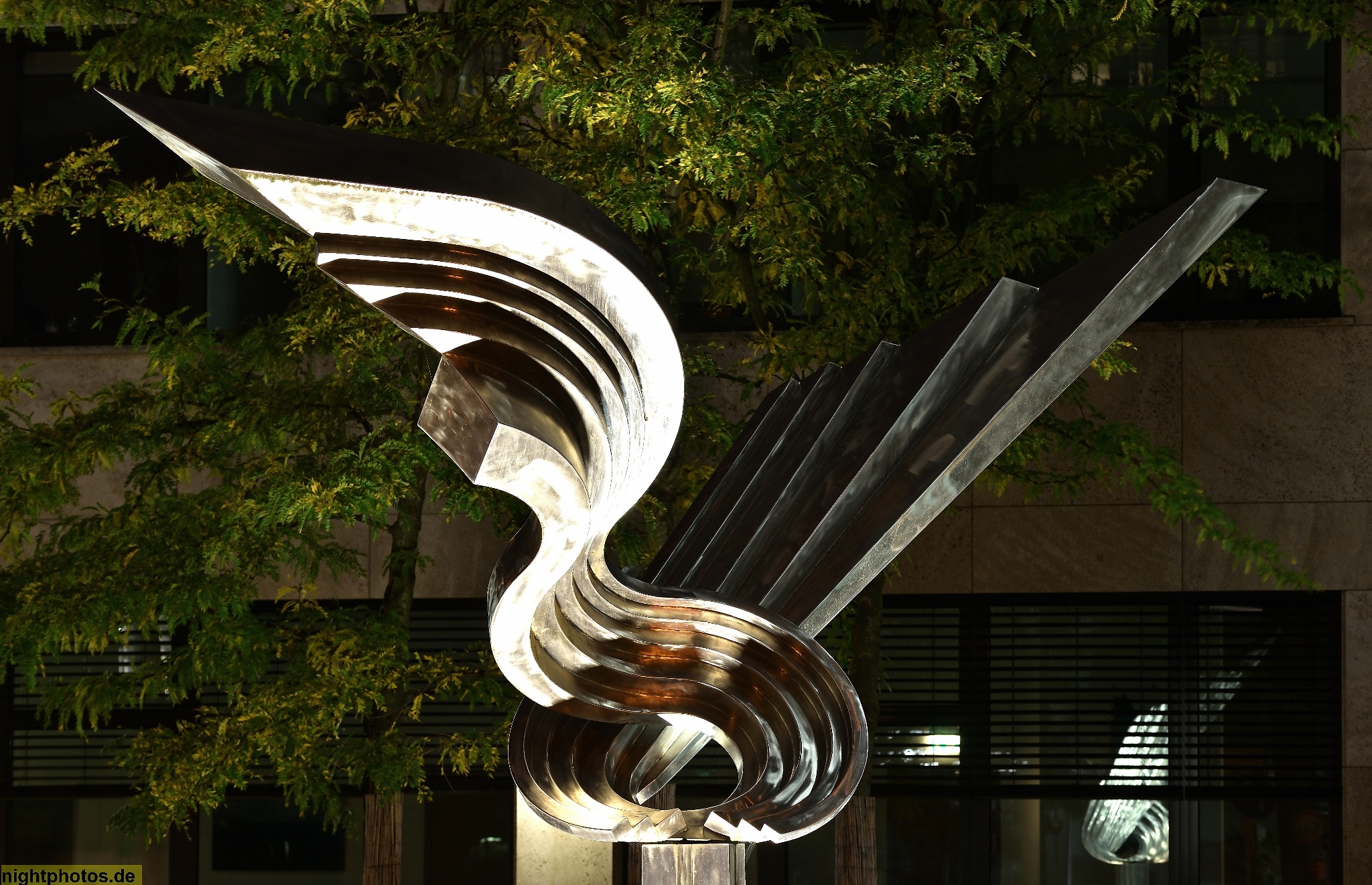 #abendstimmung #angestrahlt #berlin #bild #blaue stunde #charlottenburg #errichtet 1996 #foto #fotografie #galerie #gallery #illumination #kassenärztliche bundesvereinigung #kbv #kunst #kunstwerk #modern #photo #photography #skulptur #volkmar haase #wegelystrasse #woge mit gegenläufigen flügeln