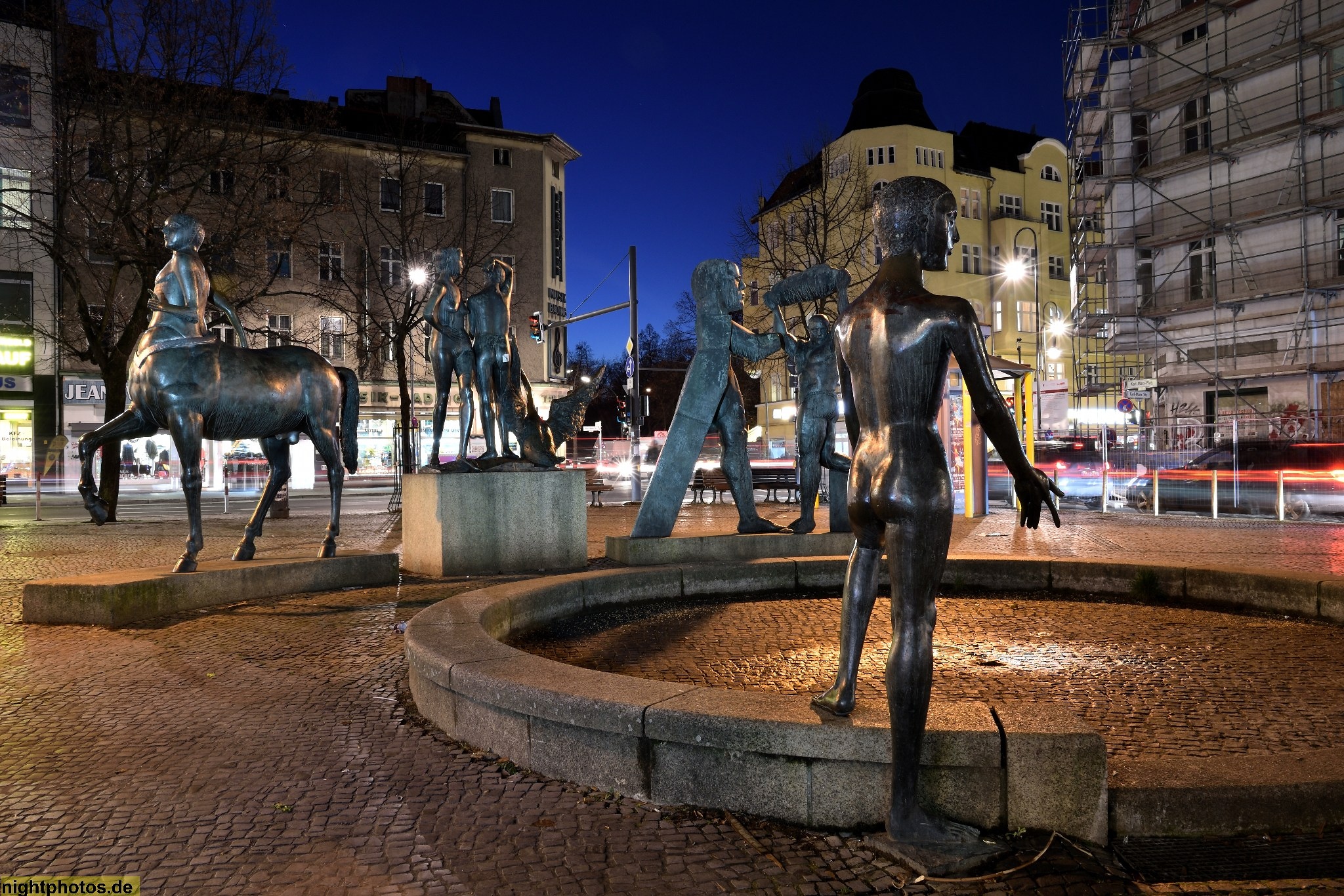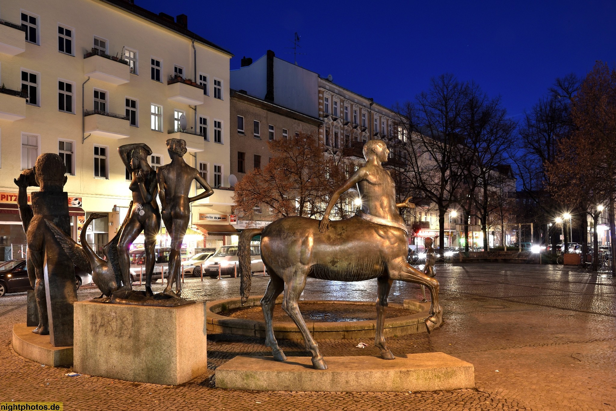 #abendstimmung #angestrahlt #berlin #bild #bildhauer hartmut bonk #blaue stunde #bronze #bronzeskulptur #city #cityscape #erschaffen 1987 #figuren #foto #fotografie #galerie #gallery #hartmut bonk #imaginaeres theater #karl-marx-platz #karl-marx-strasse #kentaur #kunst #kunstwerk #modern #nachtfoto #neukölln #photo #photography #skulpturengruppe #sockel #stadtplatz #zentaur