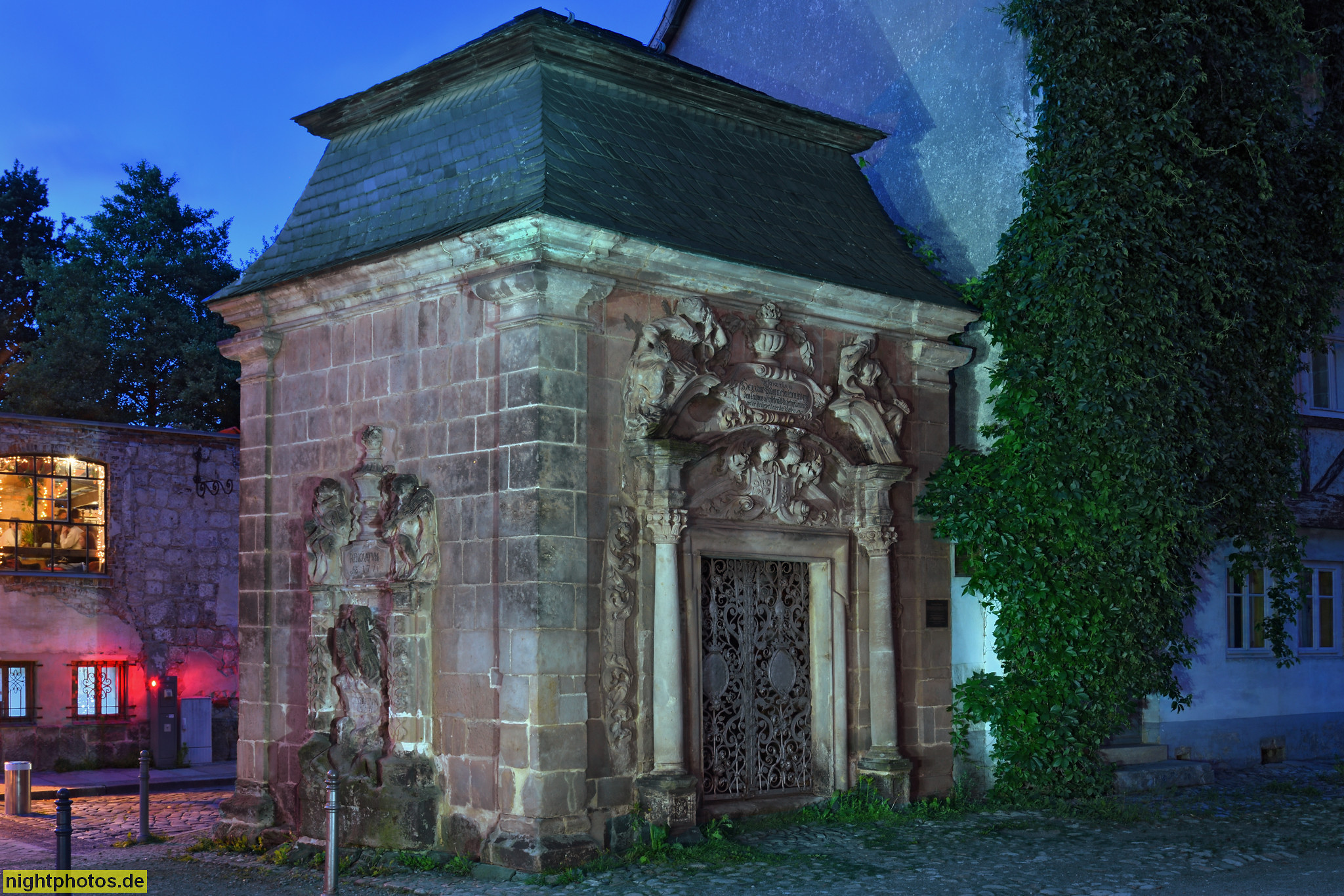 Quedlinburg. Goetzesches Mausoleum. Gruftanlage erbaut 1726 für Familie Gebhard. Übernommen 1771 von Bürgermeister Johann Andreas Goetz. Barocker Säulenportikus mit schmiedeisernem Türgitter. Marktkirchhof