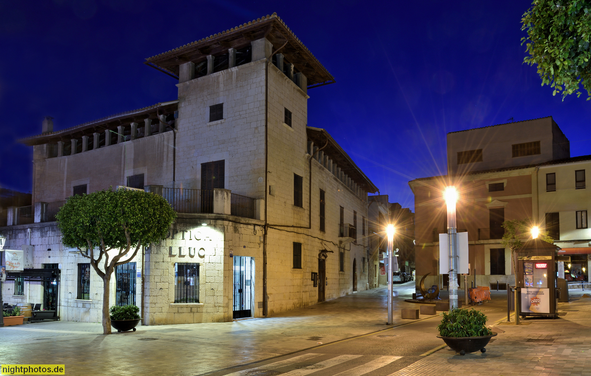 #19-20 #2019-05-26 #abendstimmung #angestrahlt #architecture #architektur #attikageschoss #balearen #bauwerk #bild #blaue stunde #building #carrer de jaume armengol #cityscape #eckturm #foto #fotografie #galerie #gallery #gebäude #historisch #illumination #inca #mallorca #nachtfoto #optica lluc #photo #photography #sandsteinquader #spanien #strassenszene #streetlife