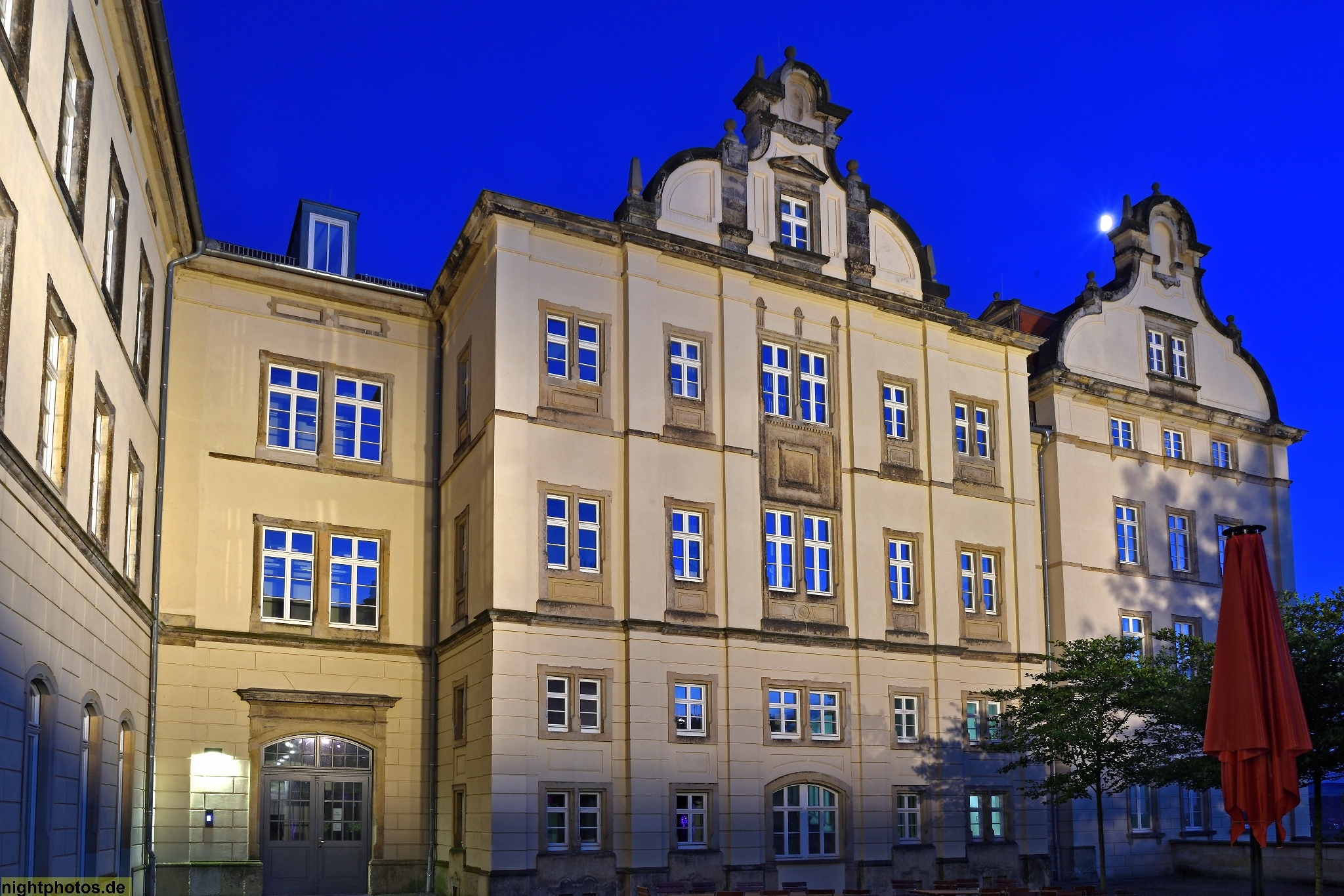 Inschrift im Portal: "Gloria in Excelsis Deo: Hanns Christoph Volckamer inwendig mich neu baute als Gott fünft Jahr zuvor ihm diese Stadt vertraute. Durchs Bürgermeister Ambt, gib höchster Gott gib Gnade das mir die Feuers Gluth, noch sonst ein Feind nicht schade. Anno 1673"