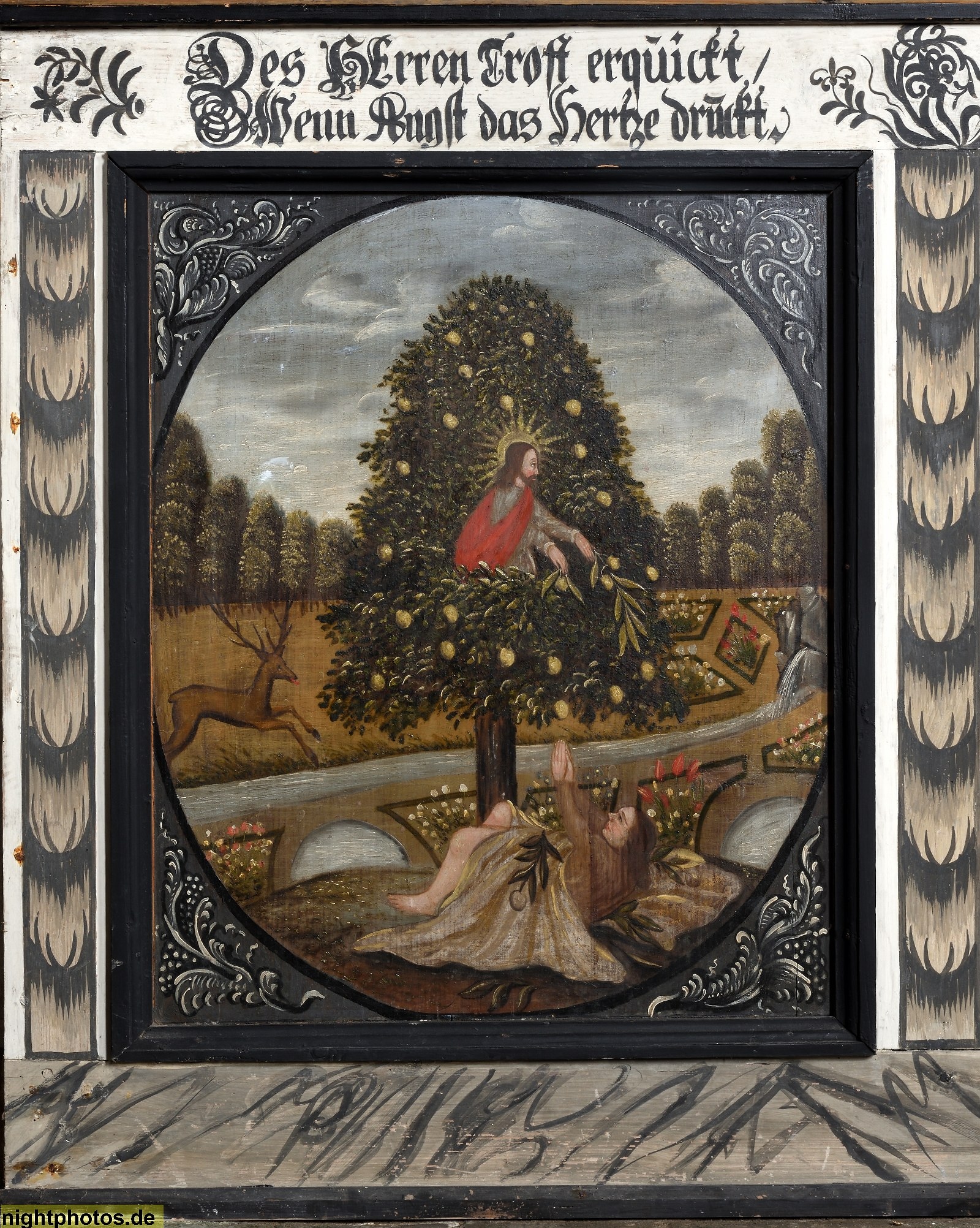 Inschrift: "Des Herren Trost erquickt wenn Angst das Hertze drückt"