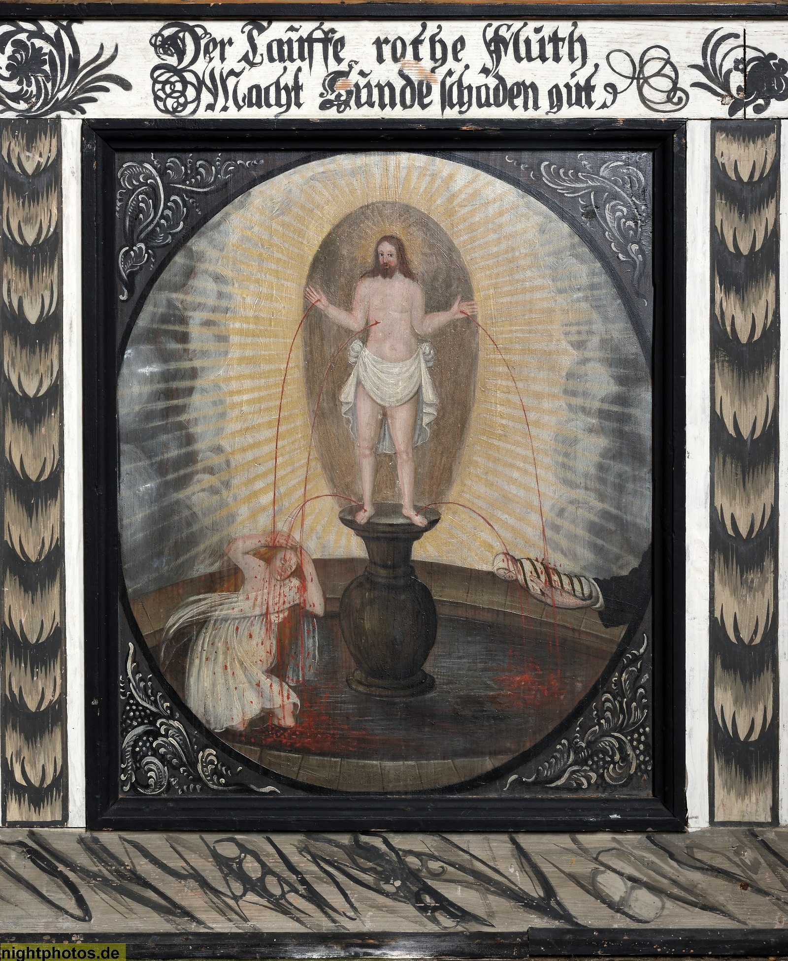 Inschrift: Der Tauffe rothe Fluth Macht Sünde Schaden gut